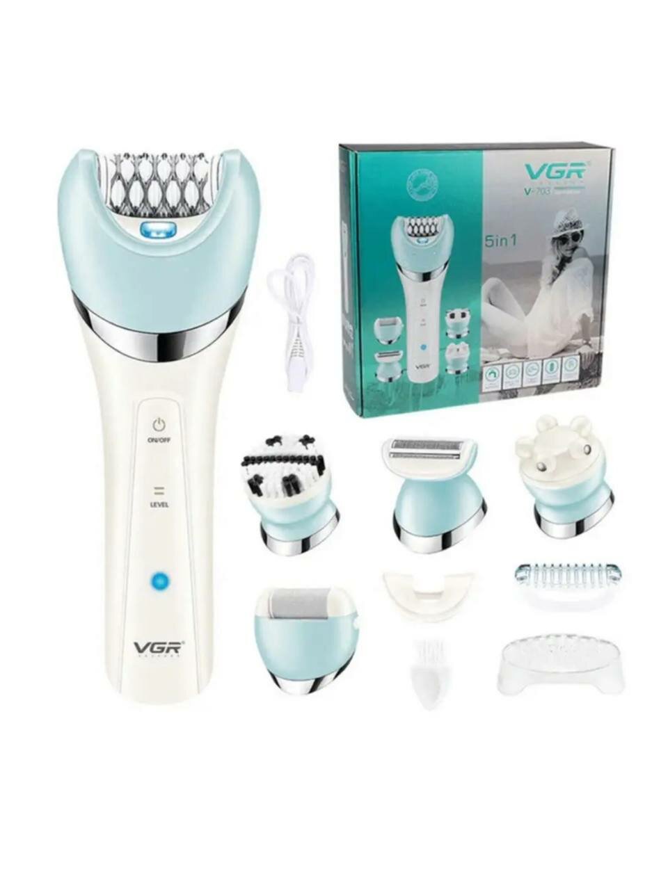 Купить Эпилятор VGR V-703, 5 в 1, массажер, пиллинг, насадка для бикини и лица, голубой, белый