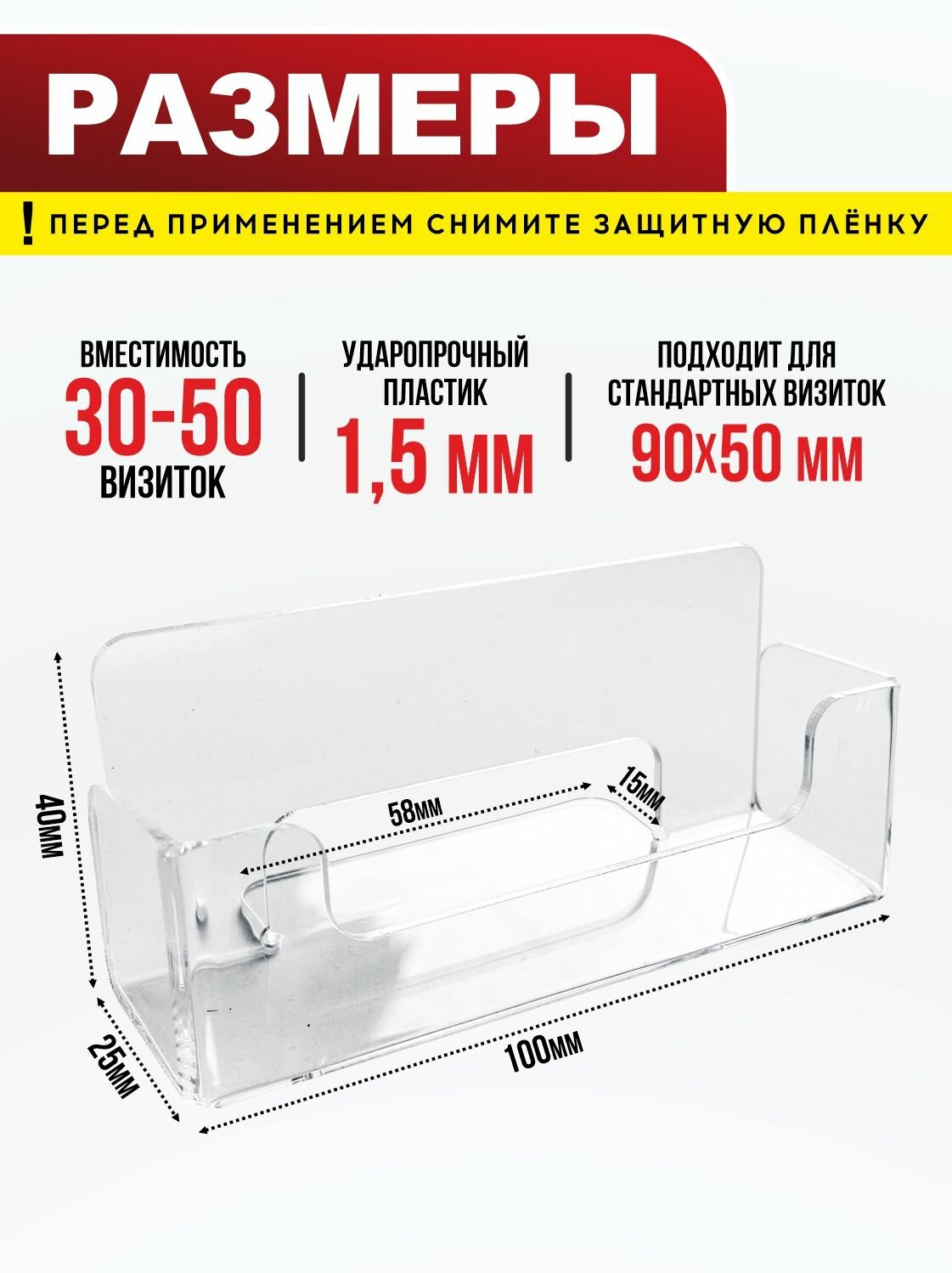 Ниже Вы можете прочитать отзывы на Визитница / Подставка для визиток настольная, 100х40х25 мм, прозрачный пластик 1,5 мм, 1 шт, Velar, ознакомится с подробными характеристиками, посмотреть интересные обзоры и фотографии на Визитница / Подставка для визиток настольная, 100х40х25 мм, прозрачный пластик 1,5 мм, 1 шт, Velar.