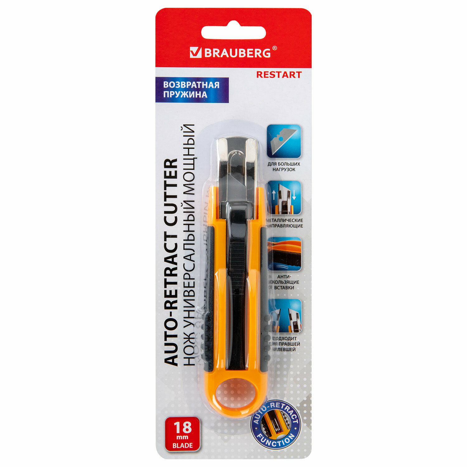 Нож канцелярский строительный универсальный мощный, ширина 18 мм, возвратная пружина, трапециевидное лезвие, Brauberg Restart, 238730 интересное: