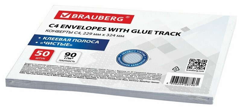 Конверты С4 (229х324 мм), комплект 300 шт., клеевой слой, Куда-Кому, внутренняя запечатка, 90 г/м2, BRAUBERG, 112178, С4НПР-50(BRAUBE