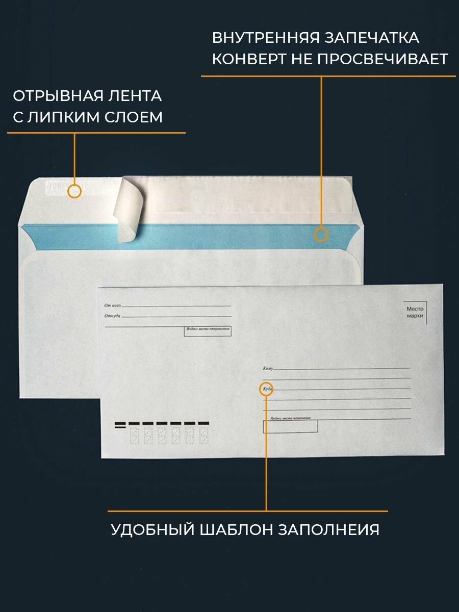 Почтовые конверты бумажные Е65 (110х220мм) 500 шт. отрывная лента запечатка кому-куда для документов E65