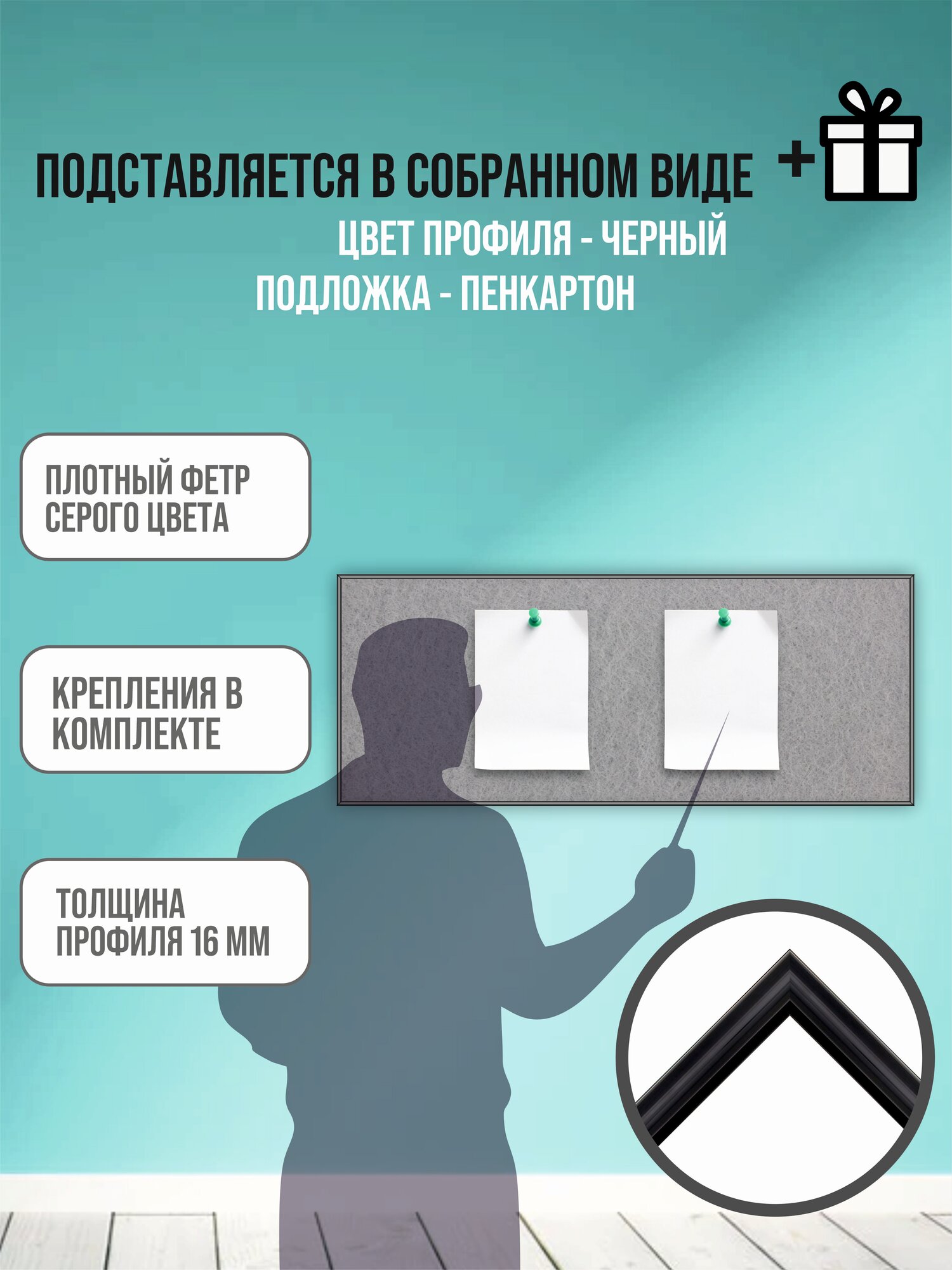 Доска из фетра текстильная информационная для заметок, фото, в алюминиевой черной раме 40х100 см интересное: