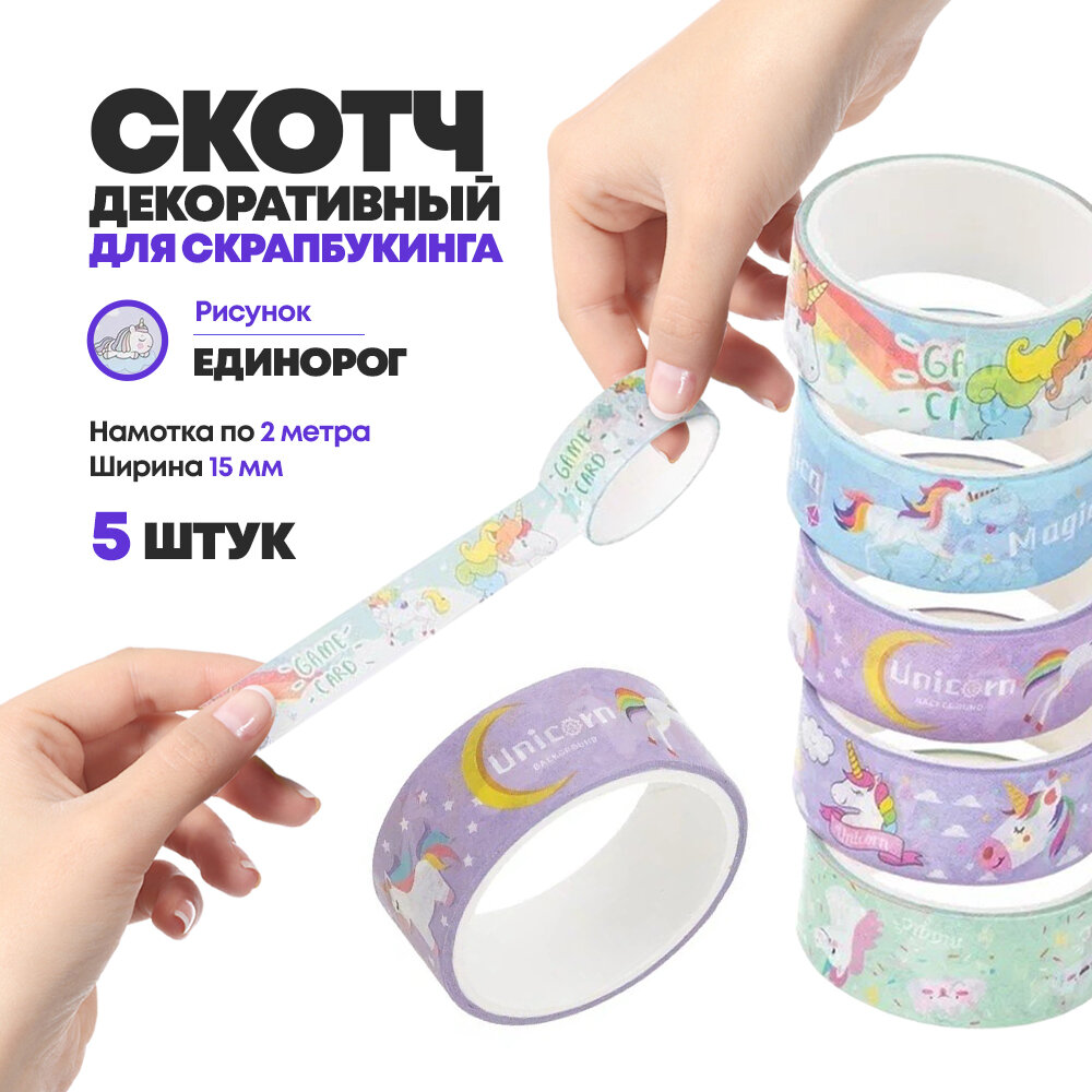 Скотч декоративный MC-Basir "Единороги", односторонний, матовый, 15x2 м, 5 шт интересное: