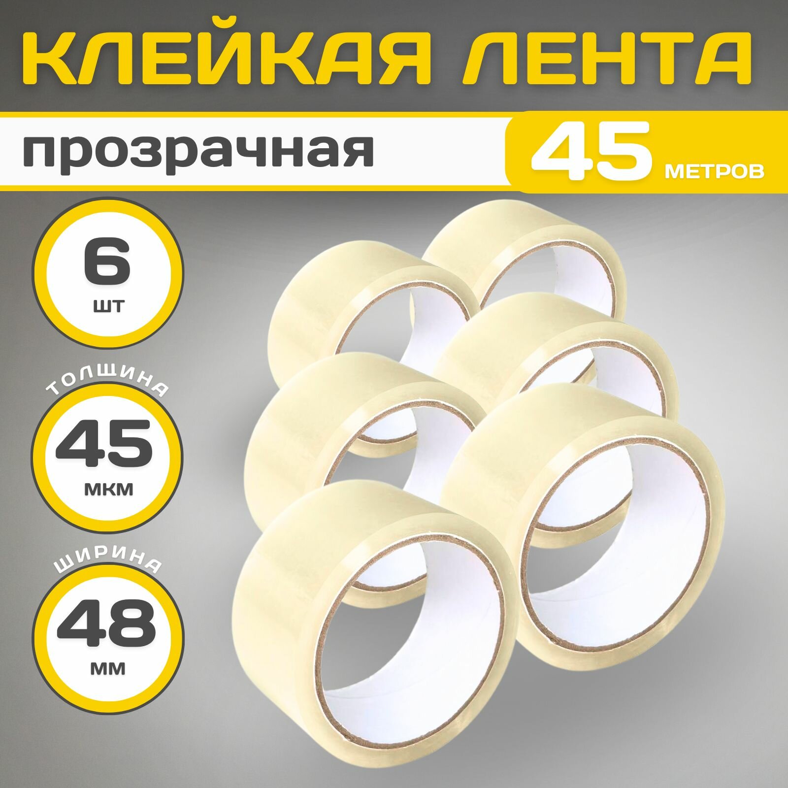 Купить Скотч упаковочный, канцелярский, 48х*45м*45 мкм, прозрачный, односторонний, 6 шт