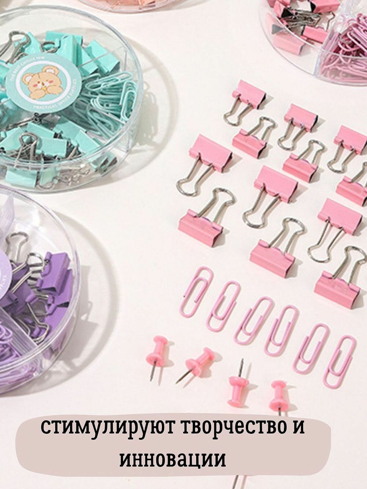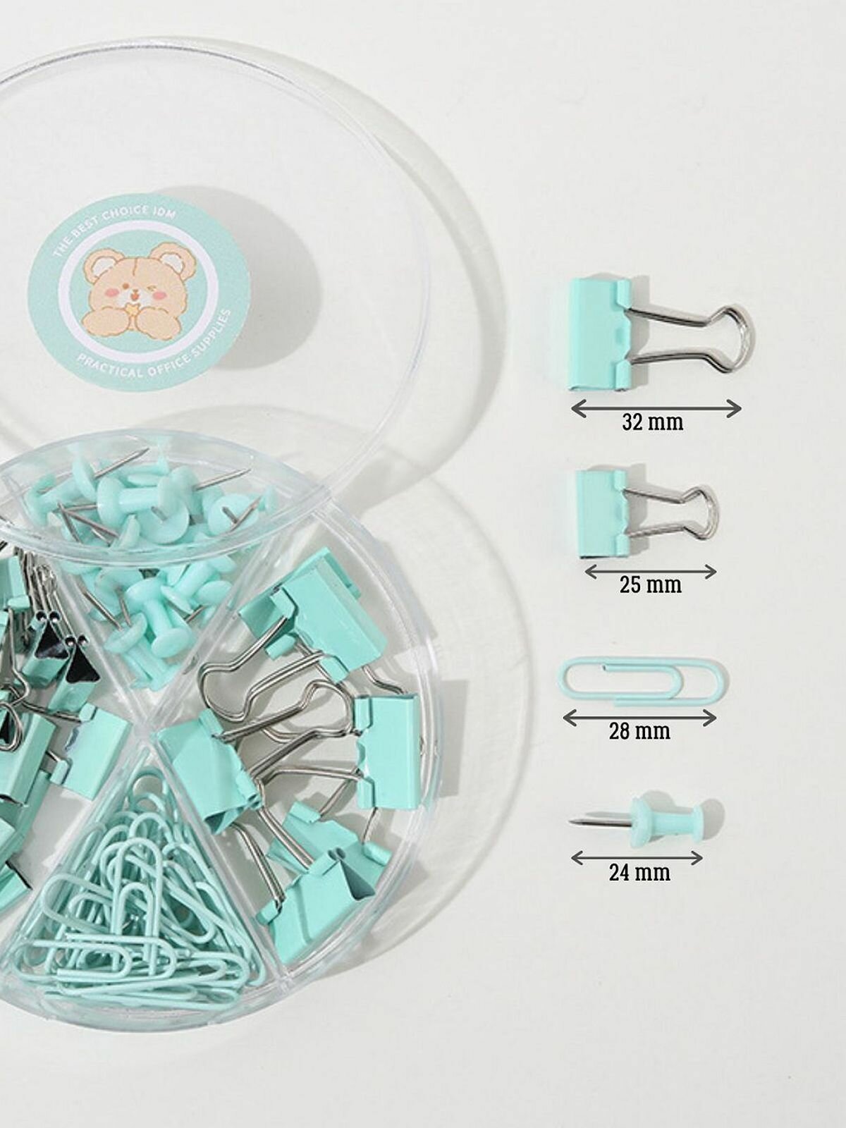 Набор канцелярский бирюзовый из 4-х предметов - скрепки, зажимы 2 вида, кнопки (К0011-027) интересное: