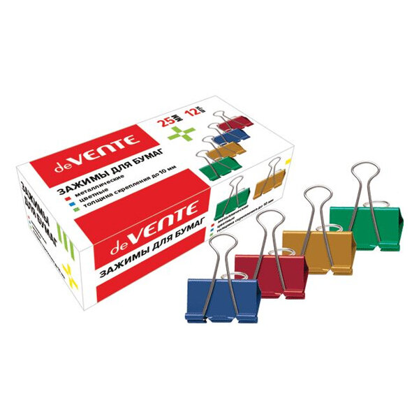 Зажимы для бумаг deVENTE Металлические, 41 мм, толщина скрепления до 17 мм, ассорти цветов, 12 шт