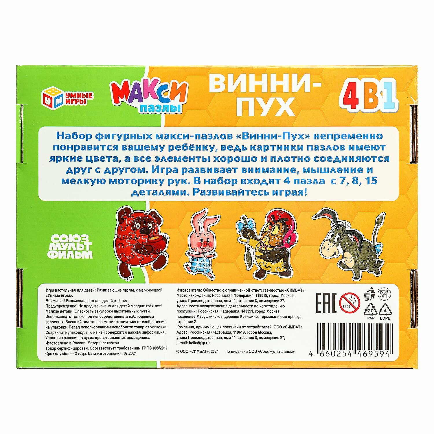 Макси-пазлы развивающие для детей Винни-Пух Умные игры 4 больших пазла интересное: