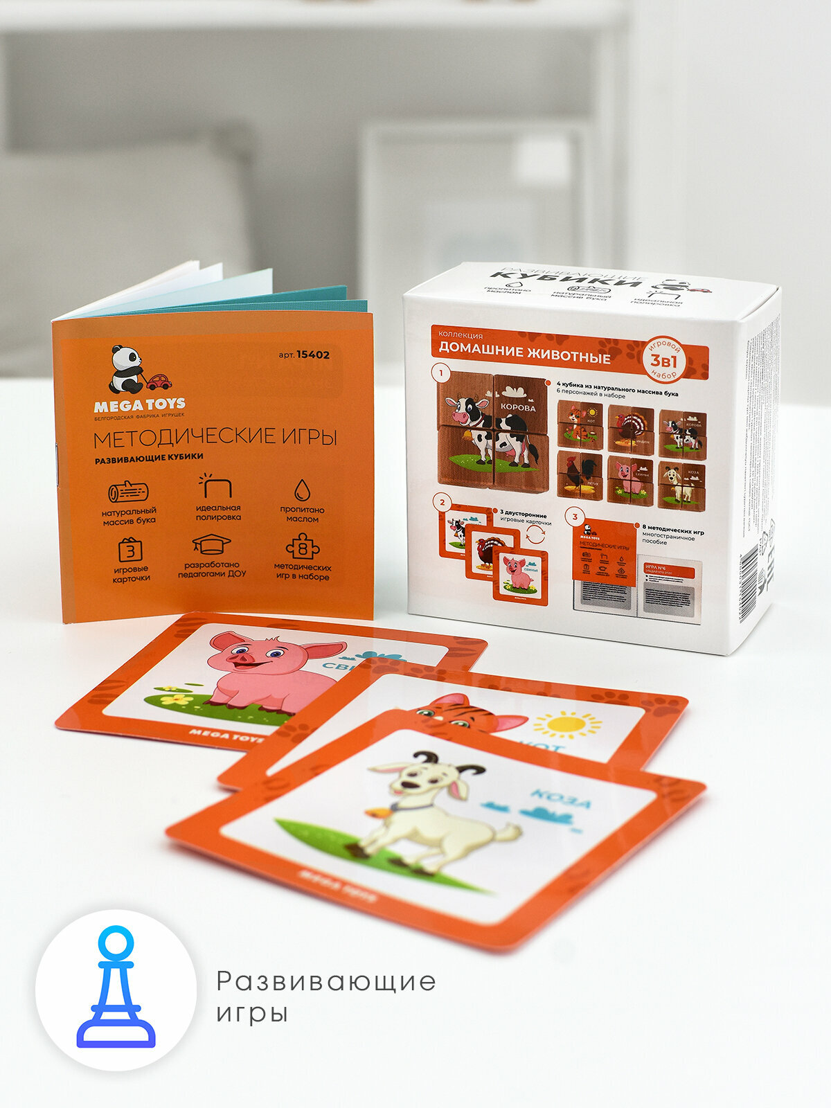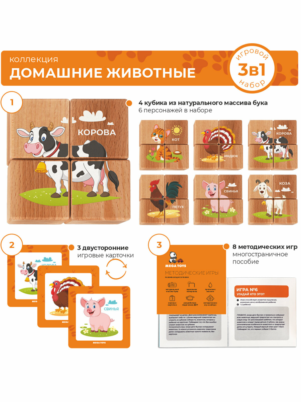 Кубики детские деревянные с рисунками "Домашние животные" MEGA TOYS развивающие игрушки от 1 года / карточки обучающие игры в наборе интересное: