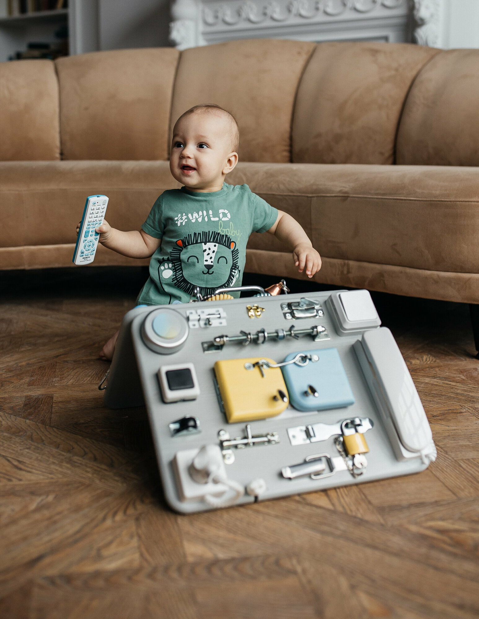 Купить Бизиборд развивающий со светом, 40/30 см. двойной, цвет серый