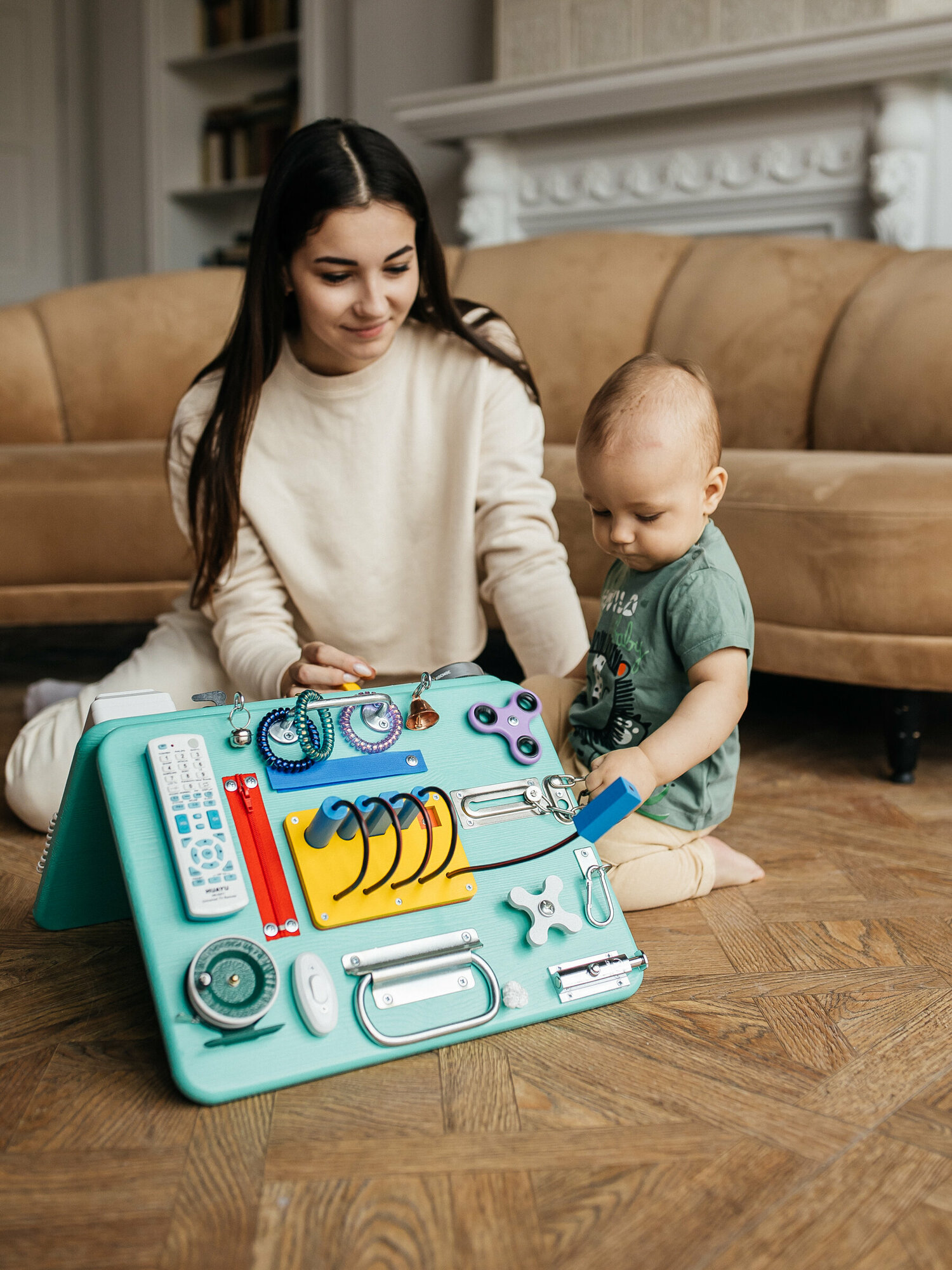 Бизиборд развивающий со светом, 40/30 см. двойной, цвет пудровый