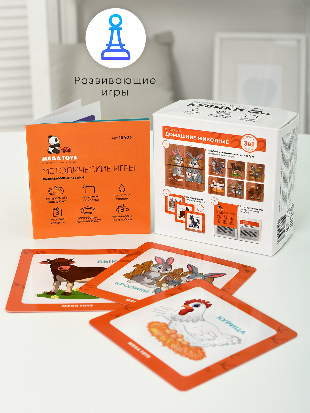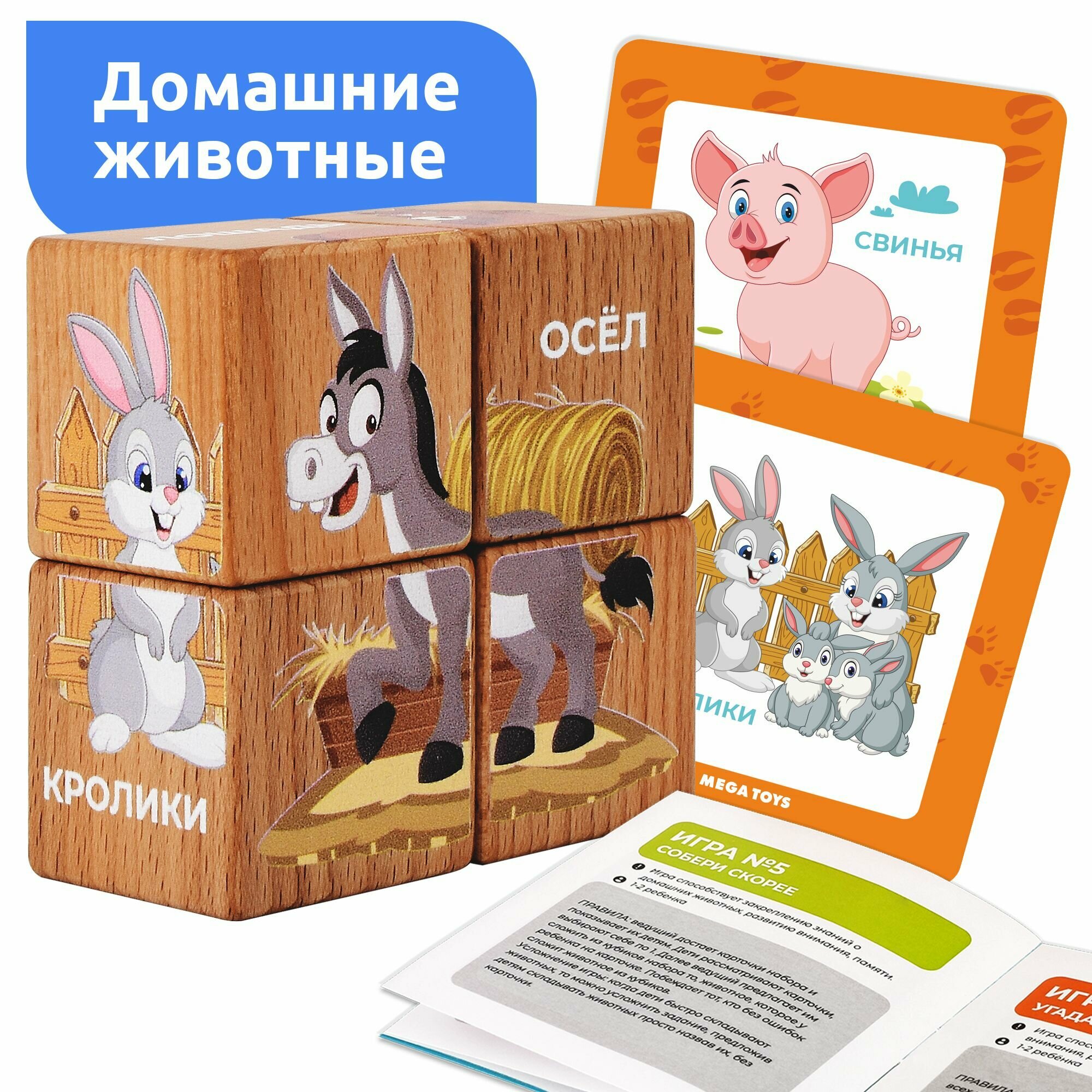 Кубики детские деревянные с рисунками Домашние животные MEGA TOYS развивающие игрушки от 1 года / карточки и обучающие игры в наборе интересное: