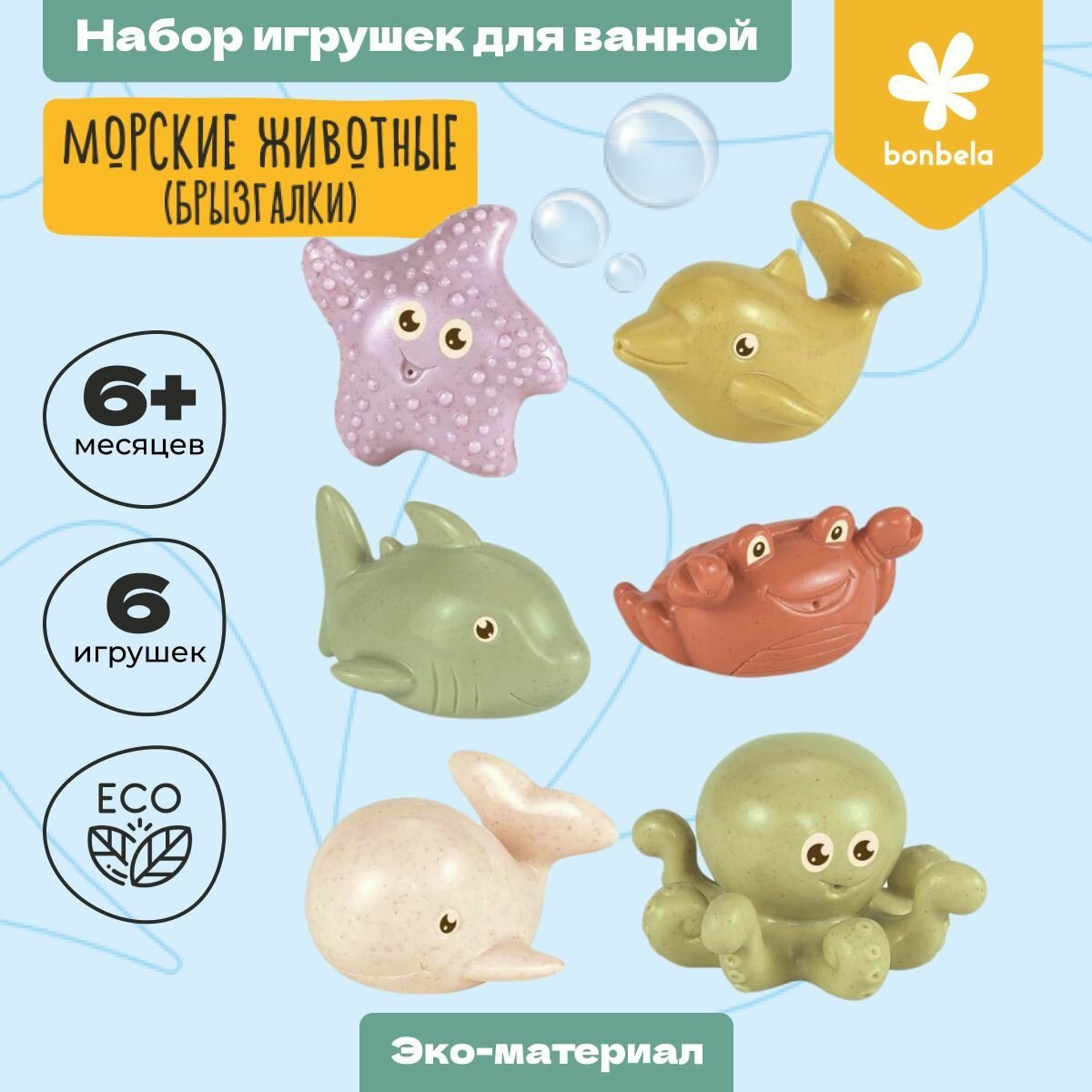 Игрушки для ванной (брызгалки) 6 штук Bonbella "Морские животные №2" из эко-материала интересное: