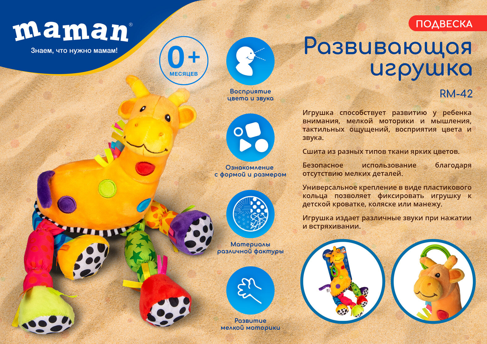 Развивающая игрушка-погремушка 0+ "Жирафик" Maman RM-42, для кроватки/коляски/манежа, звуковые эффекты, мультиколор интересное: