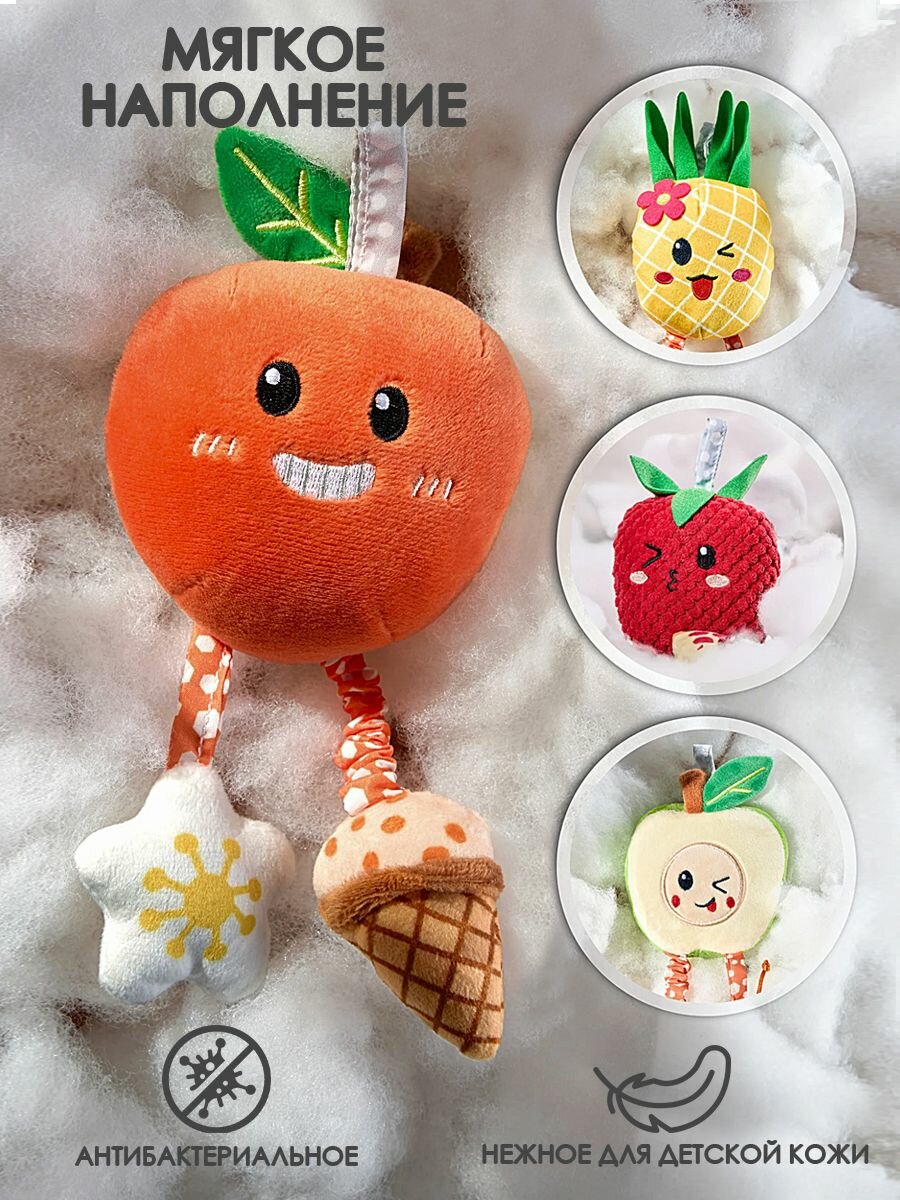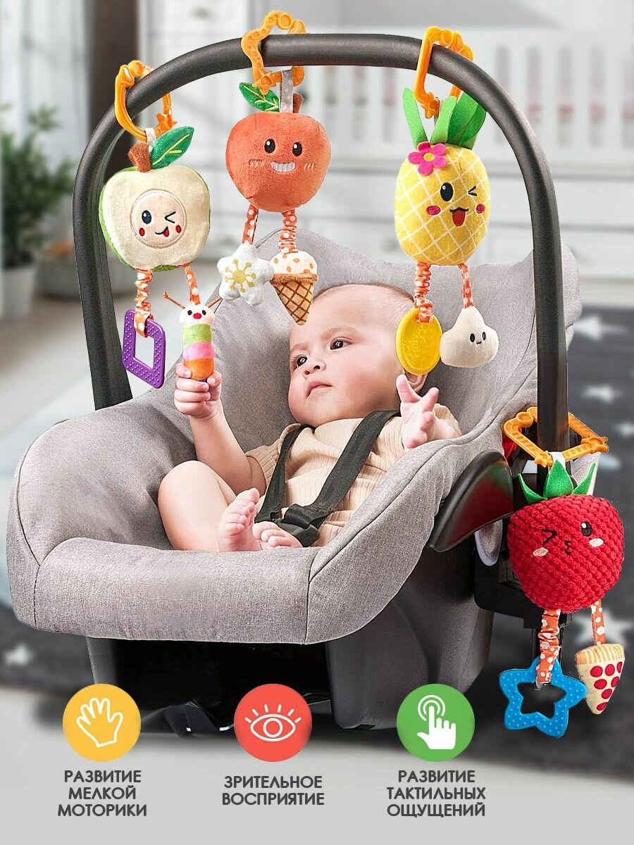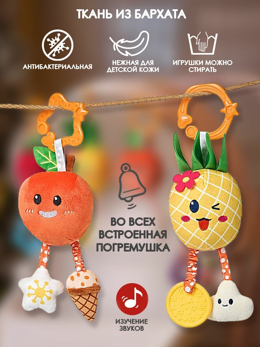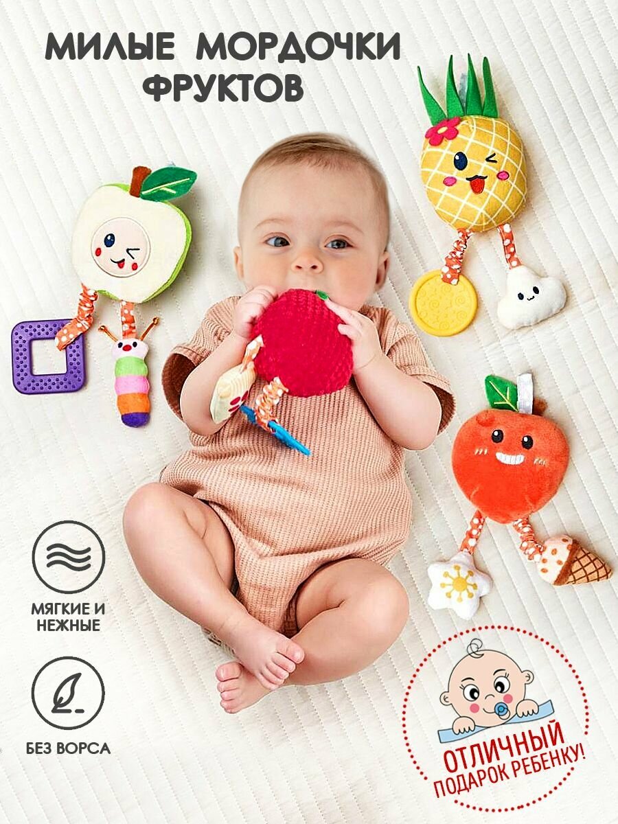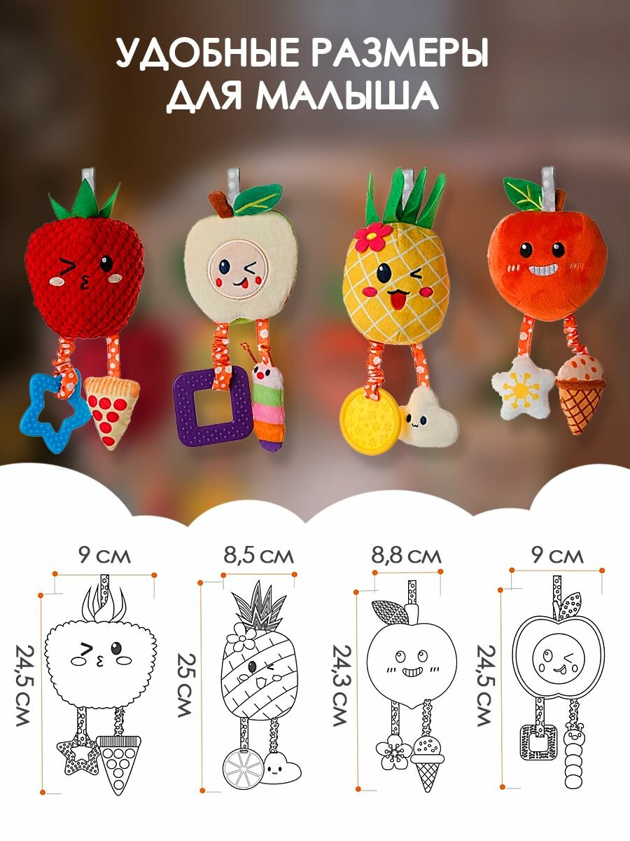 Подвесная погремушка Мультяшные фрукты для мальчиков и девочек на коляску и кроватку. Набор 4 шт. Развивающие монтессори игрушки для новорожденных от 0+. Дуга игровая интересное: