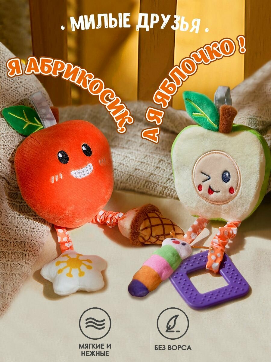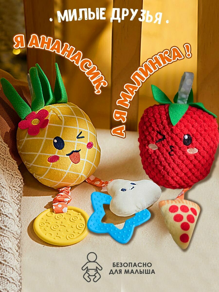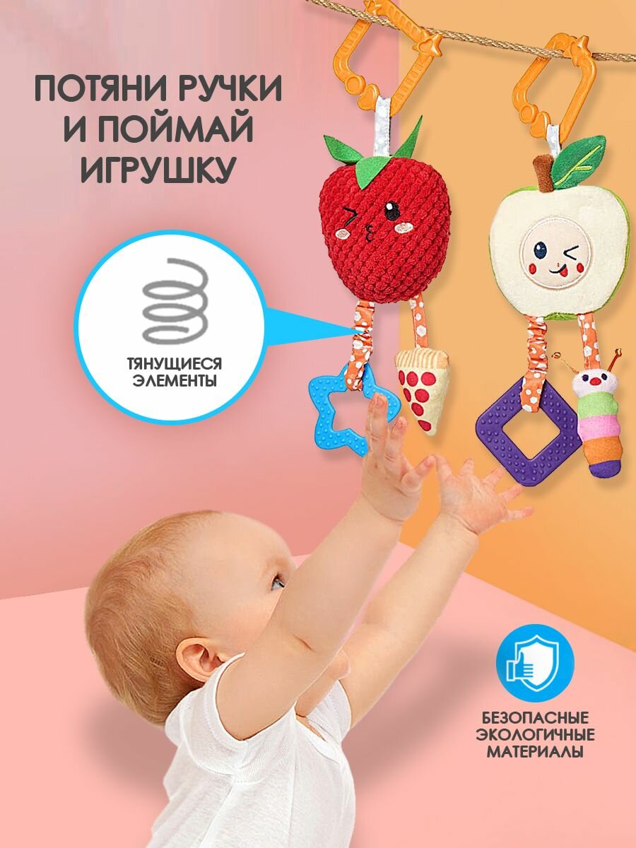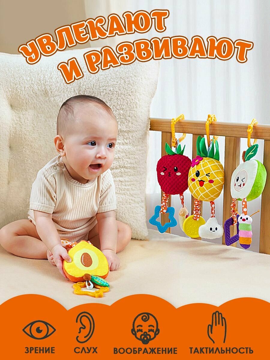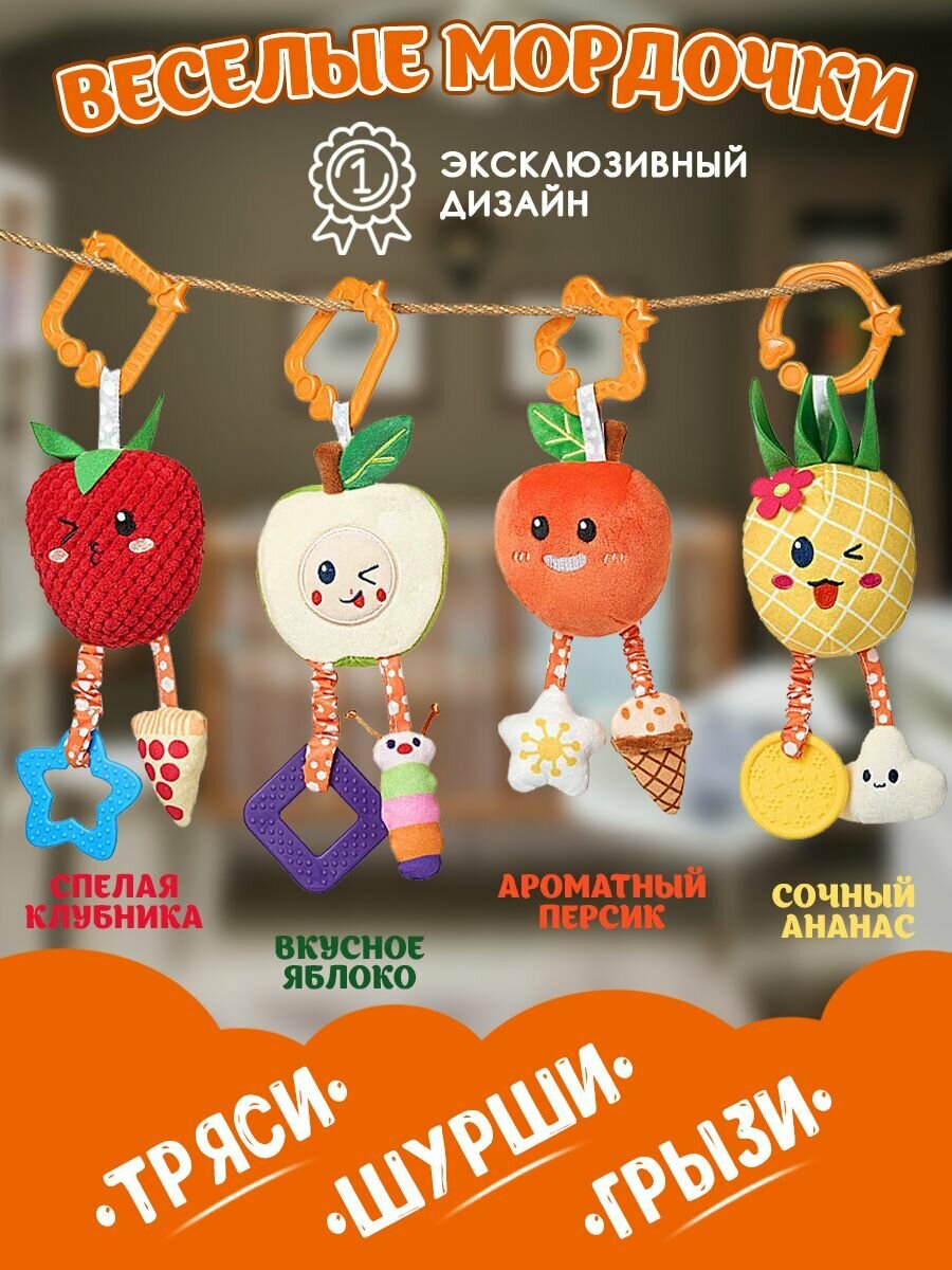 Подвесная погремушка Мультяшные фрукты для мальчиков и девочек на коляску и кроватку. Набор 4 шт. Развивающие монтессори игрушки для новорожденных от 0+. Дуга игровая интересное: