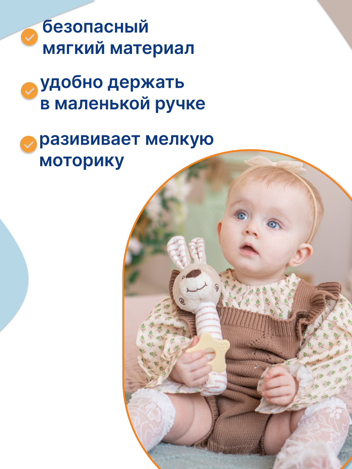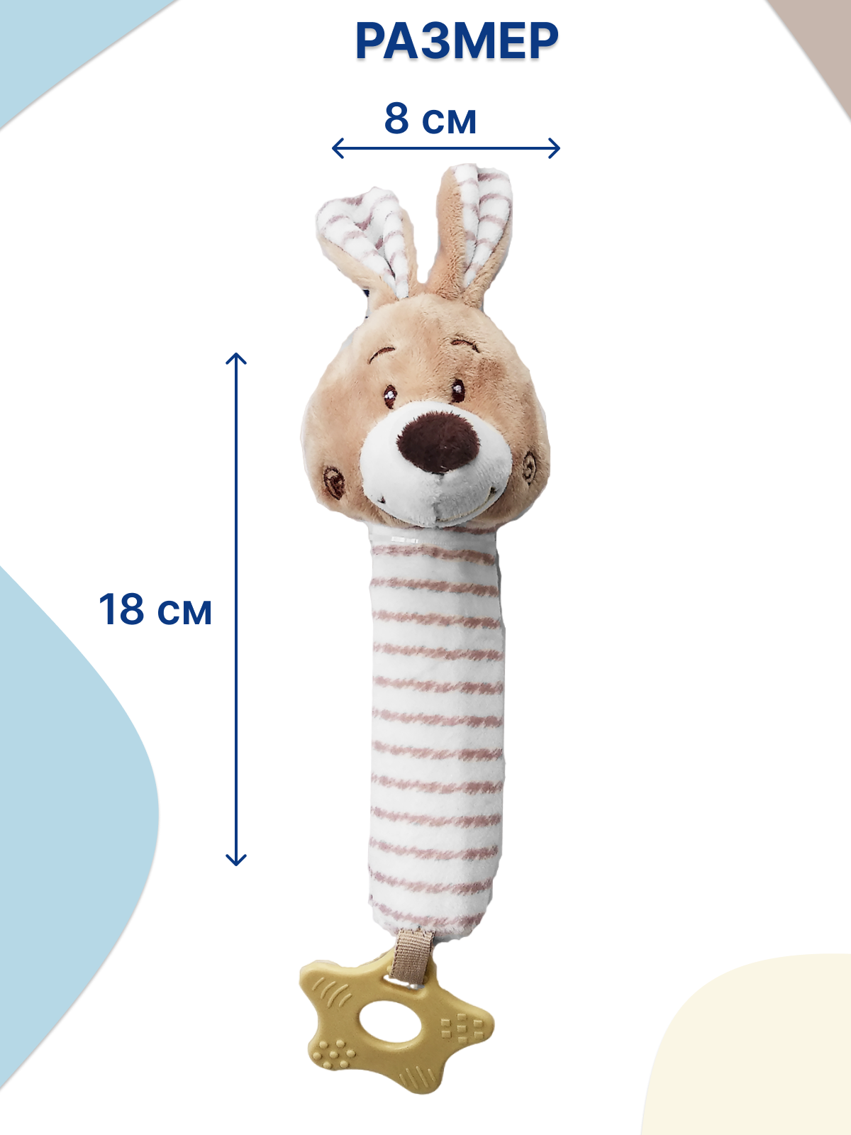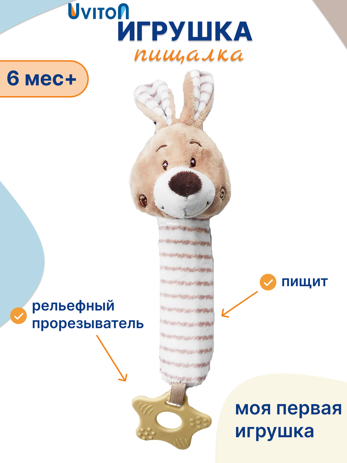 Игрушка погремушка пищалка для детей с прорезывателем Зайка от бренда Uviton интересное: