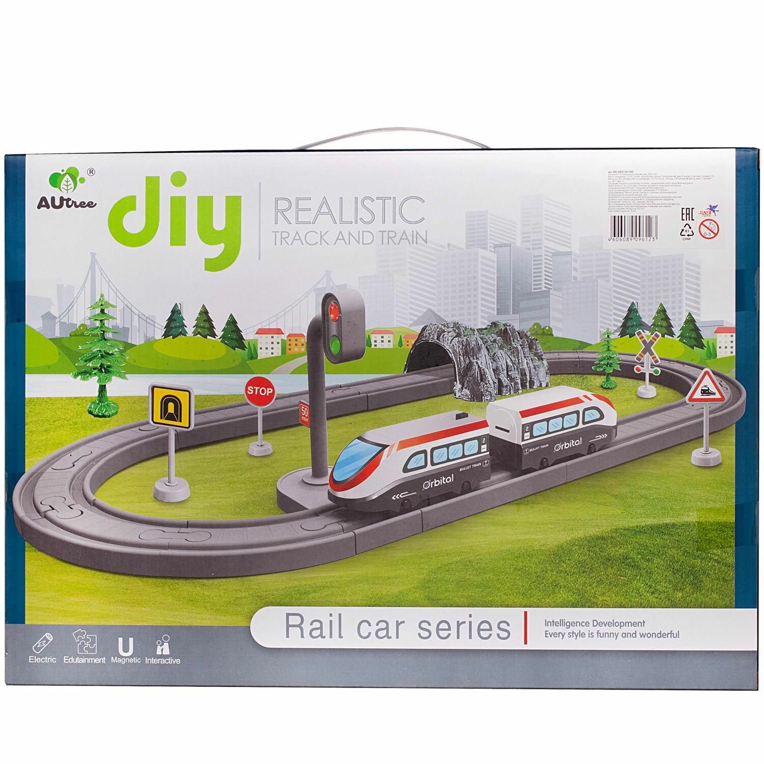 Купить Железная дорога с ландшафтным дизайном, не менее 40 деталей, со световыми эффектами, в коробке 41х10х29 см