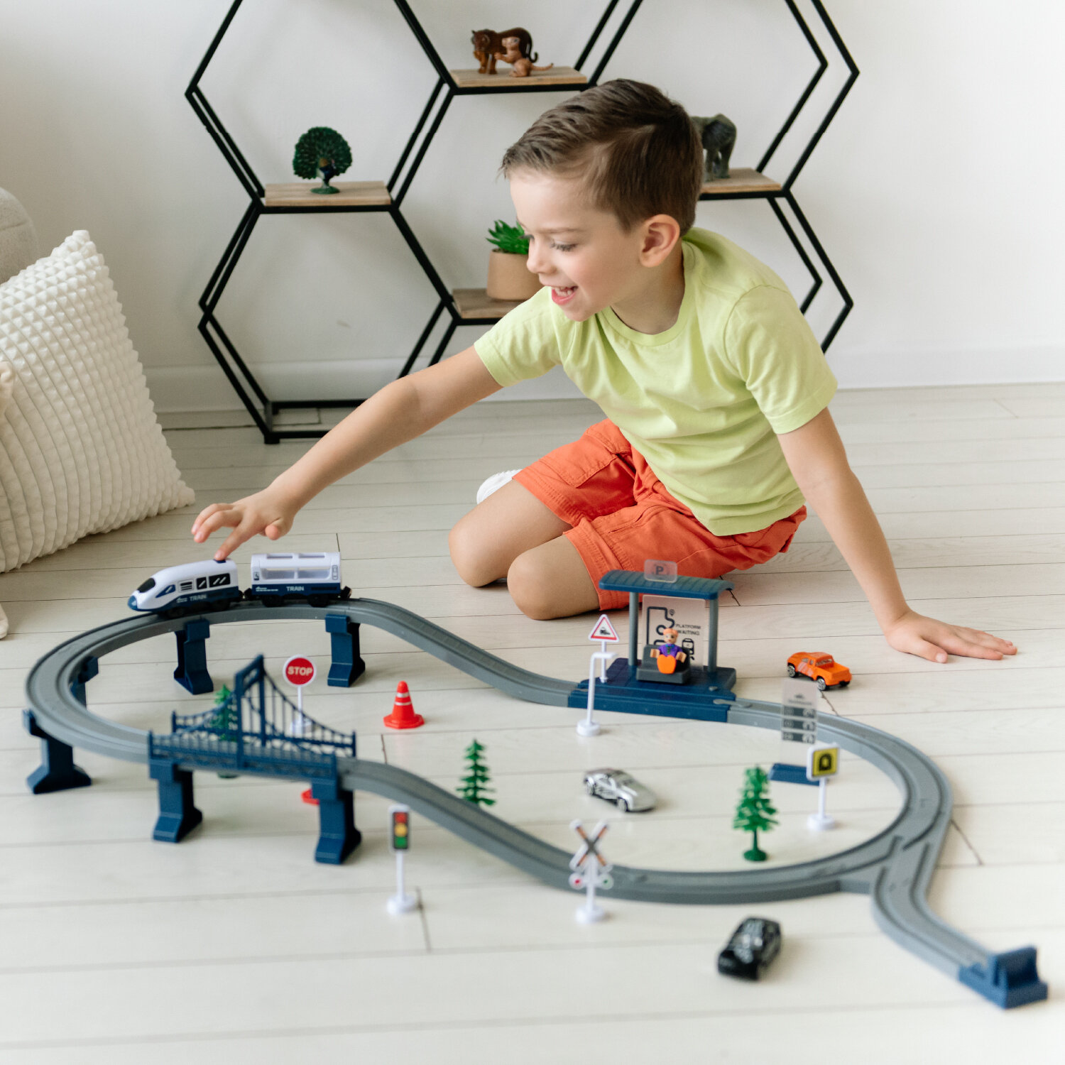 Купить Железная дорога для детей "Мой город, 63 предмета", на батарейках со светом и звуком (Синяя) G211-016