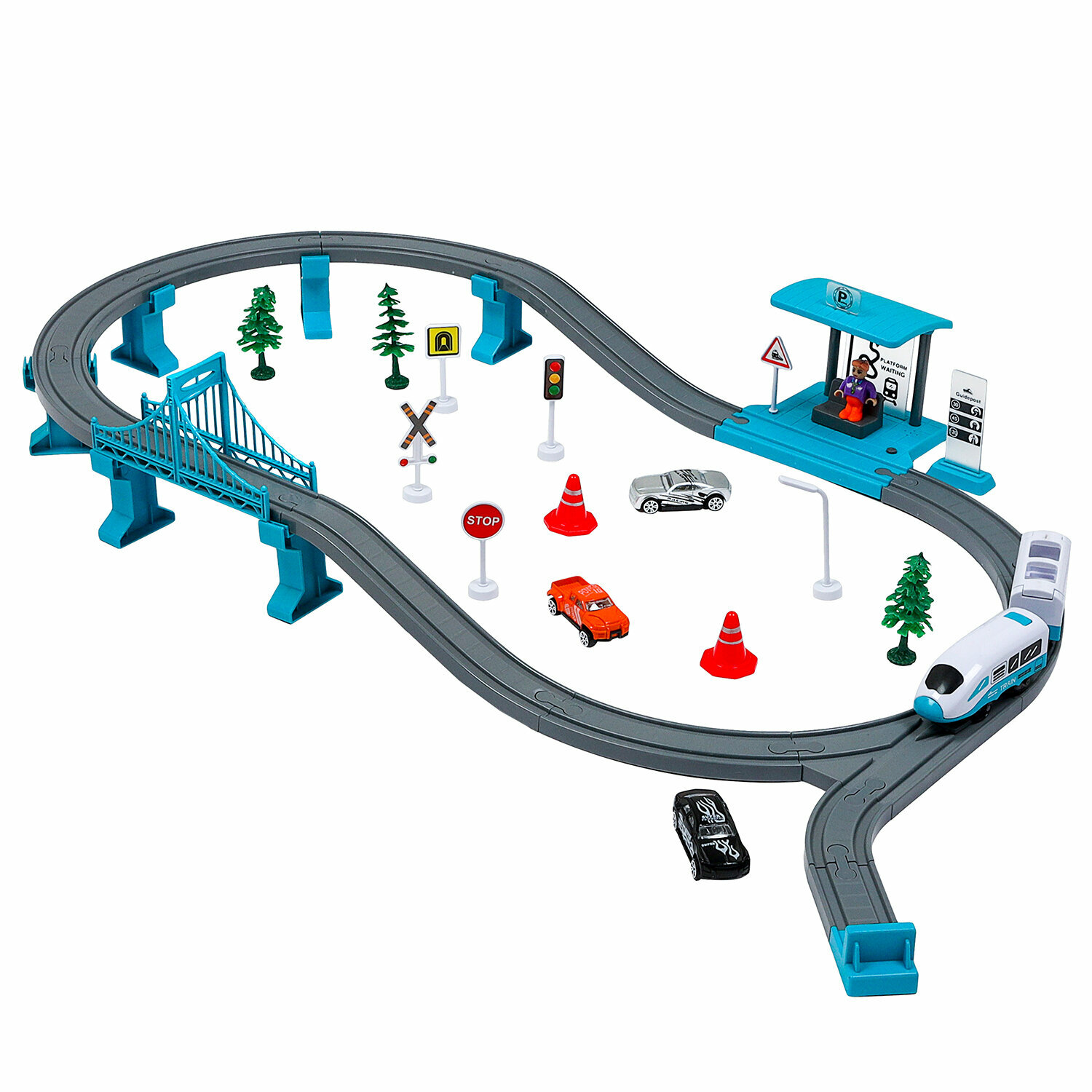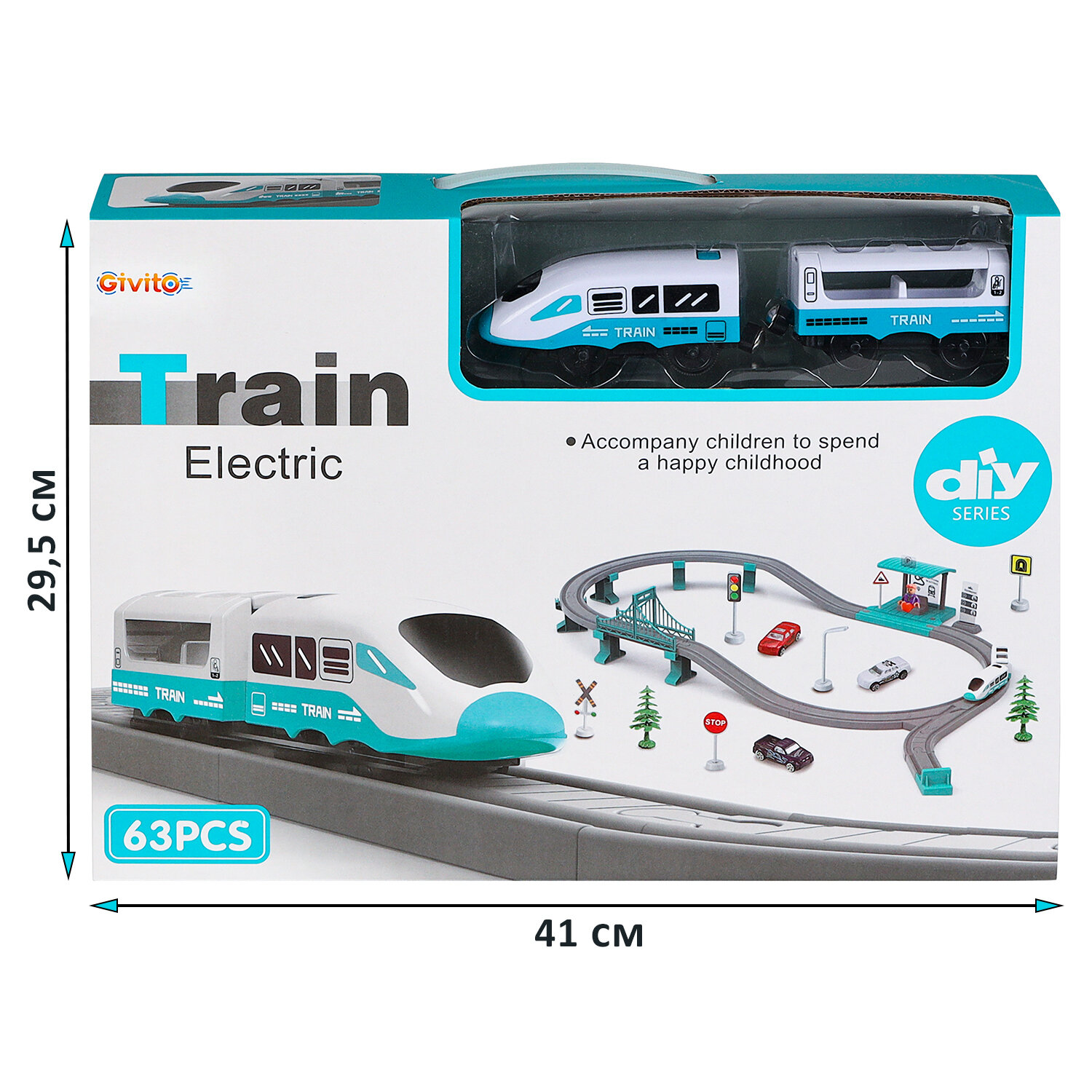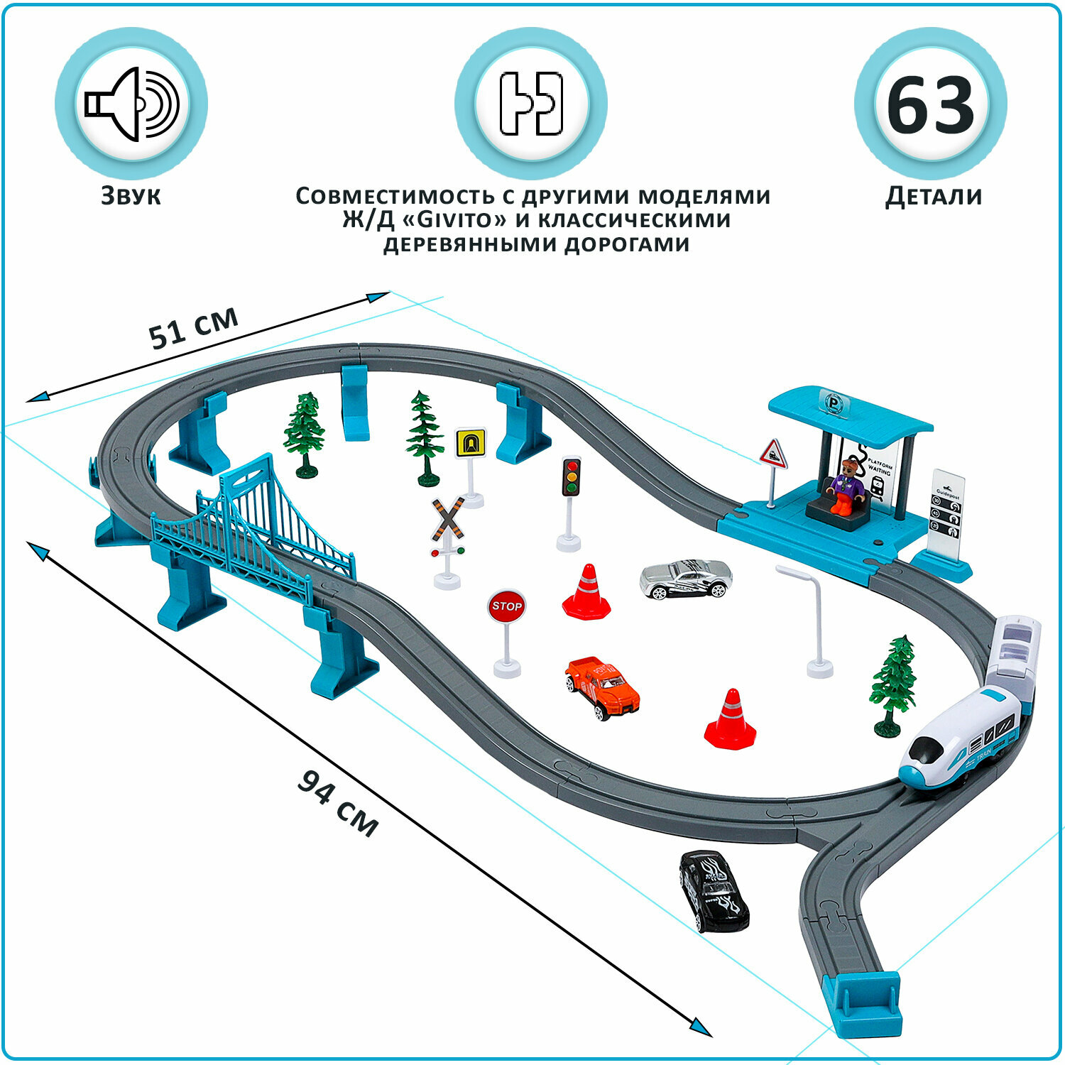 Купить Детская железная дорога Givito "Мой город, 63 предмета", на батарейках со светом и звуком (Бирюзовая) G211-015