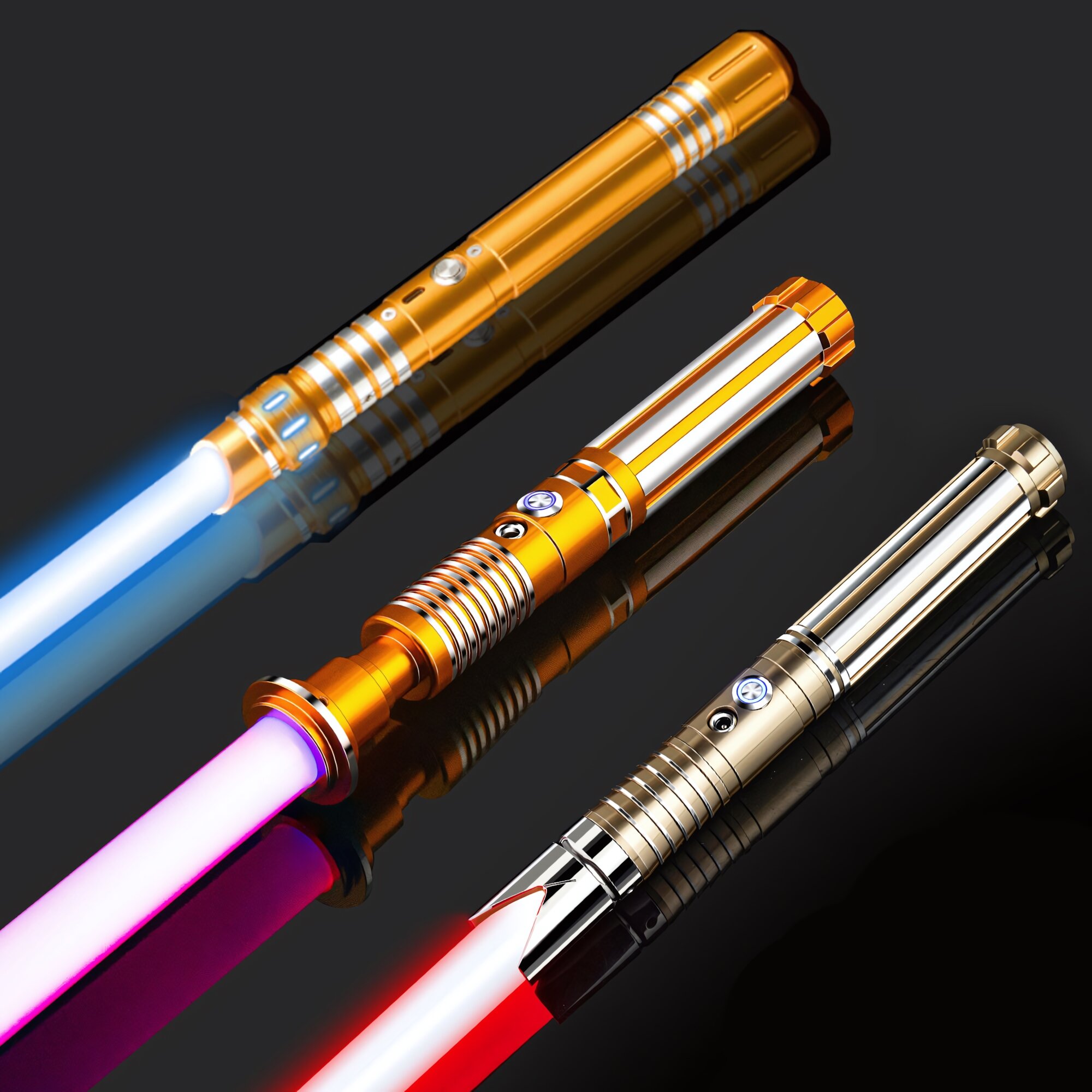 Комплект из двух световых мечей, золотая рукоять, клинок меняет цвет, звуковые эффекты, вибрация