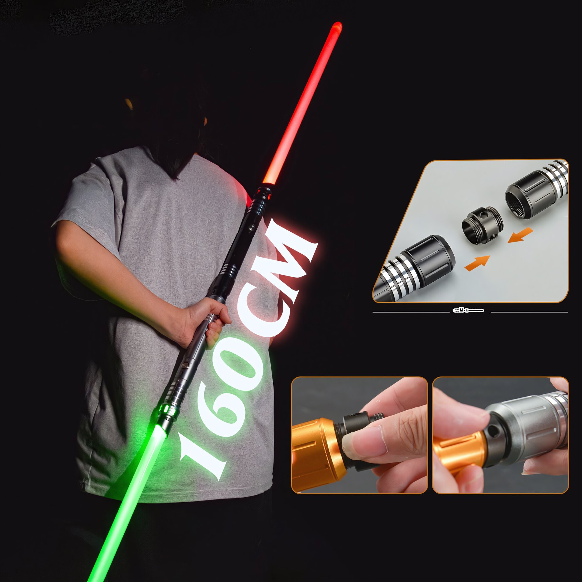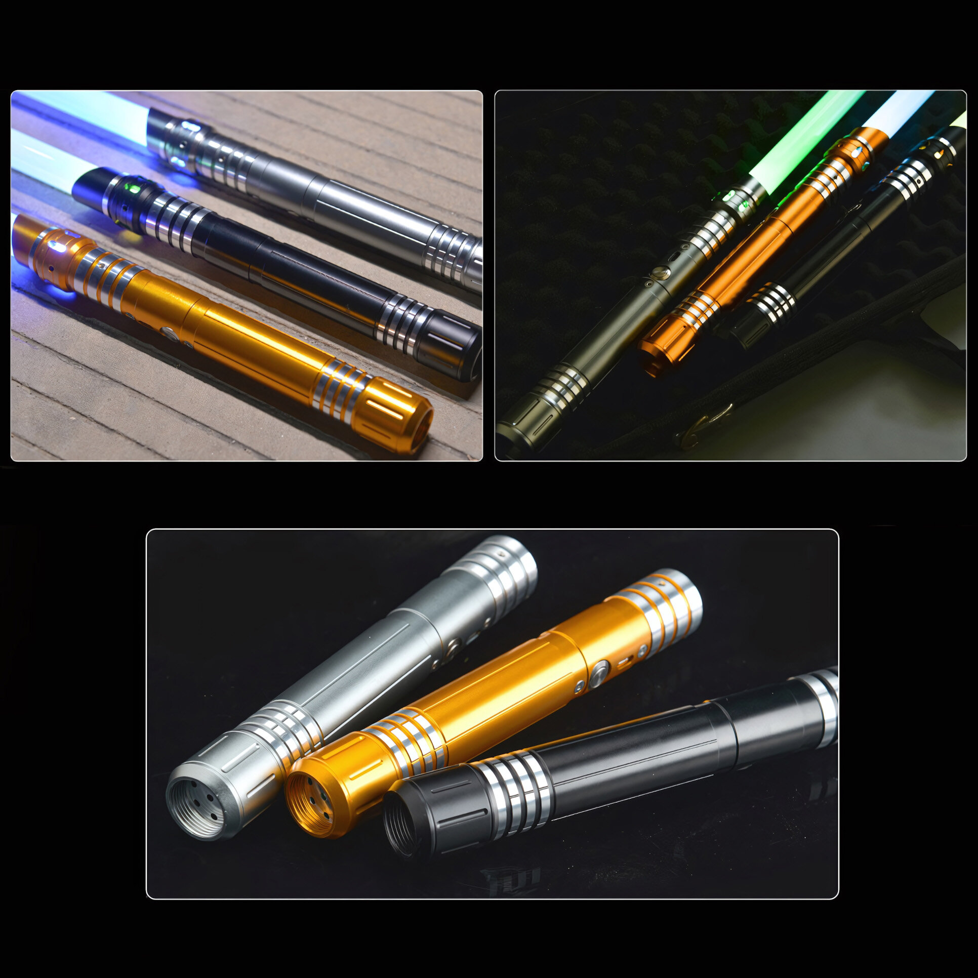 Комплект из двух световых мечей, черная и золотая рукоять, клинок меняет цвет, звуковые эффекты, вибрация