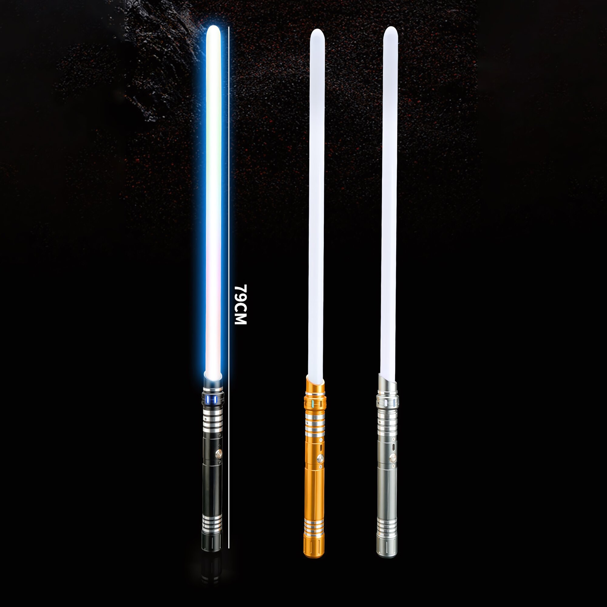 Комплект из двух световых мечей, серебряная и золотая рукоять, клинок меняет цвет, звуковые эффекты, вибрация