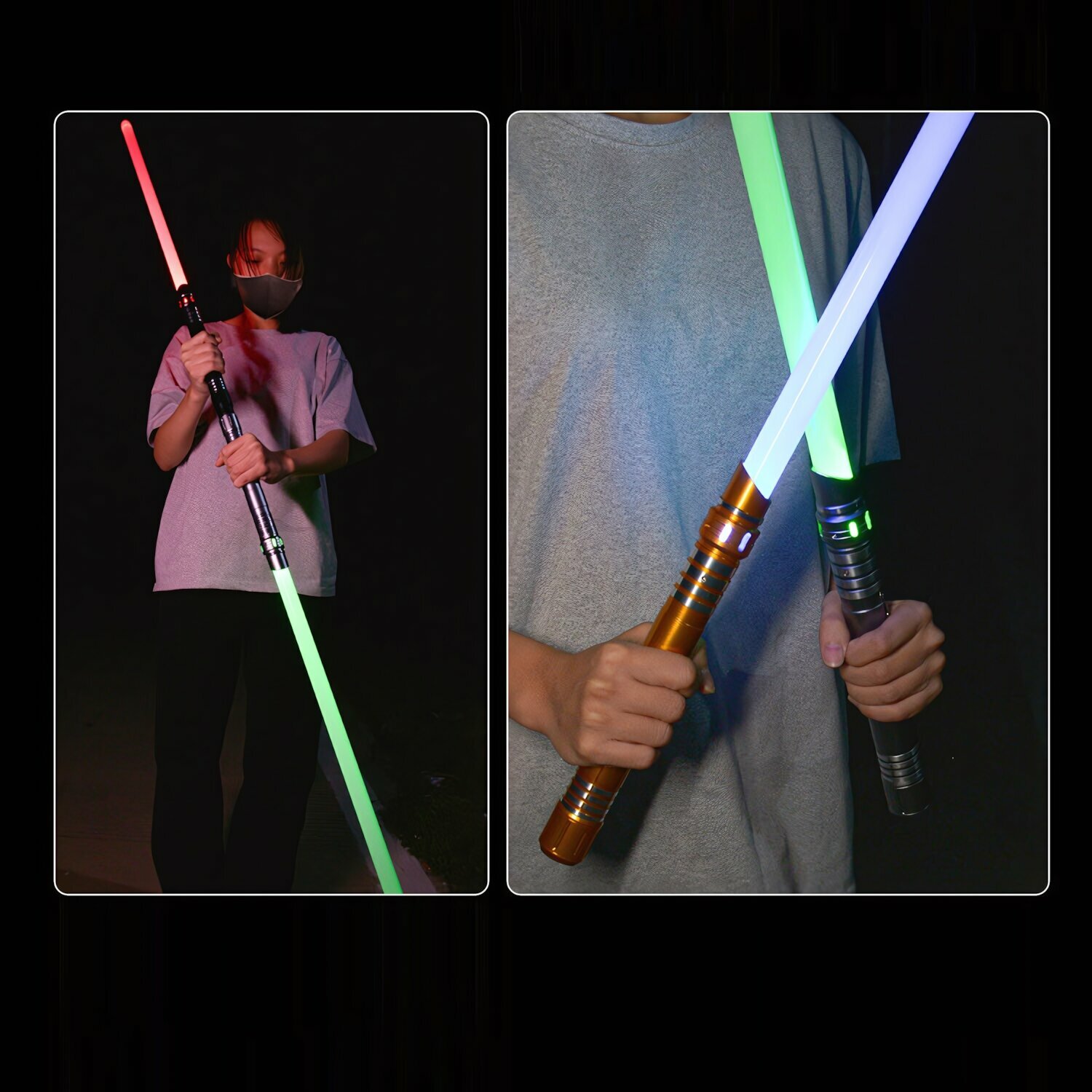 Комплект из двух световых мечей, серебряная и золотая рукоять, клинок меняет цвет, звуковые эффекты, вибрация