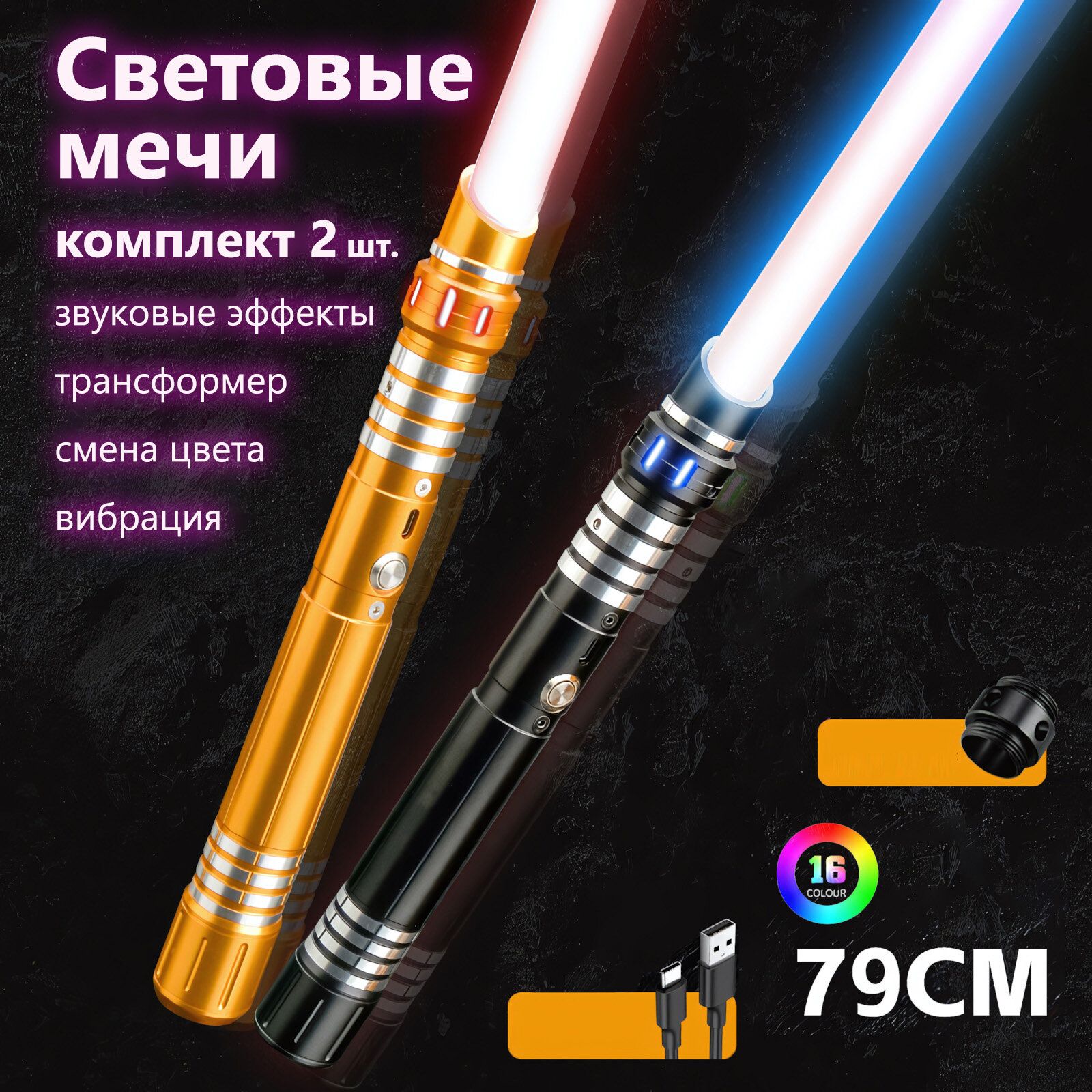 СохранитьКомплект из двух световых мечей, черная и золотая рукоять, клинок меняет цвет, звуковые эффекты, вибрация интересное: