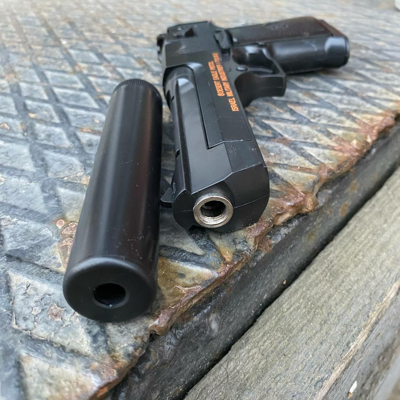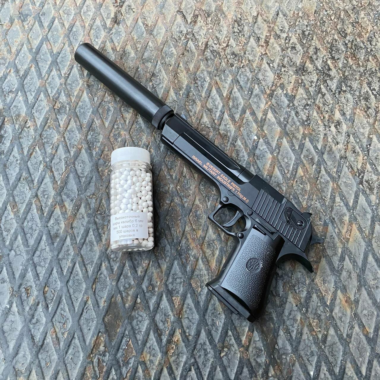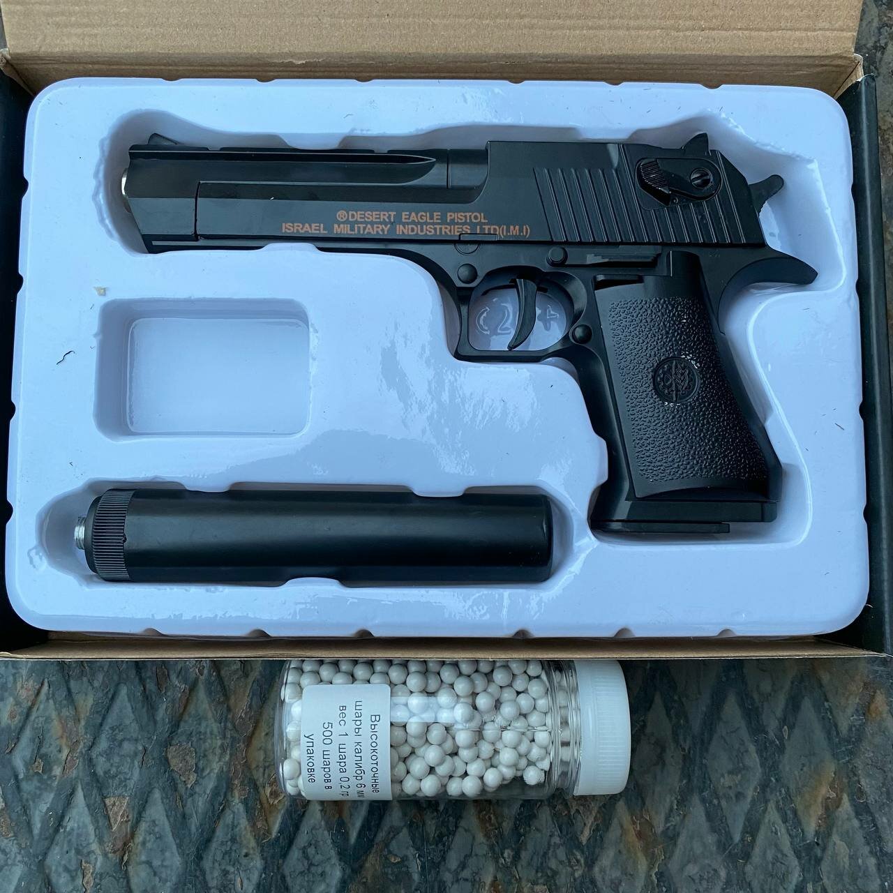 Тяжелый игрушечный пистолет с глушителем Desert eagle (Дезерт игл, пустынный орел) в комплекте с 500 пульками 6 мм интересное: