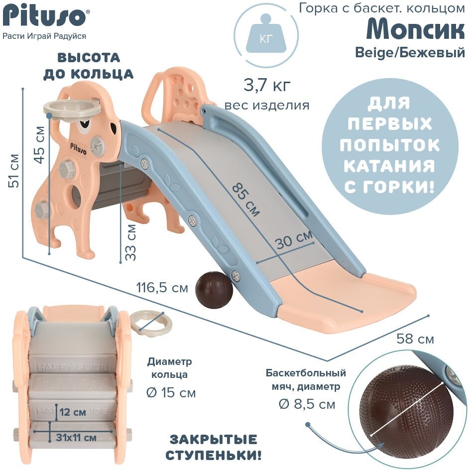 Горка детская для дома и улицы Pituso Мопсик, игровой комплекс 2 в 1 с баскетбольным кольцом, цвет бежевый интересное: