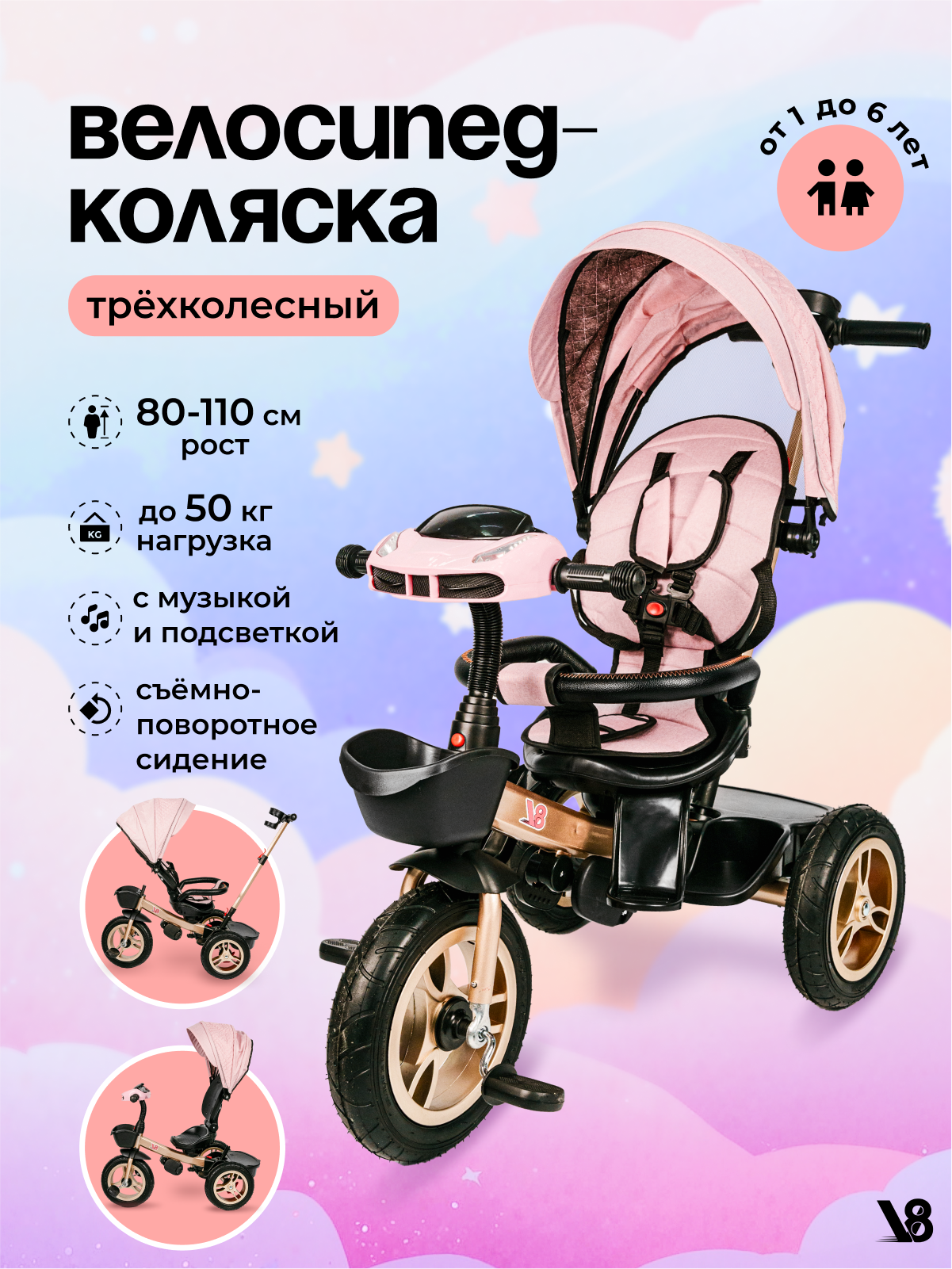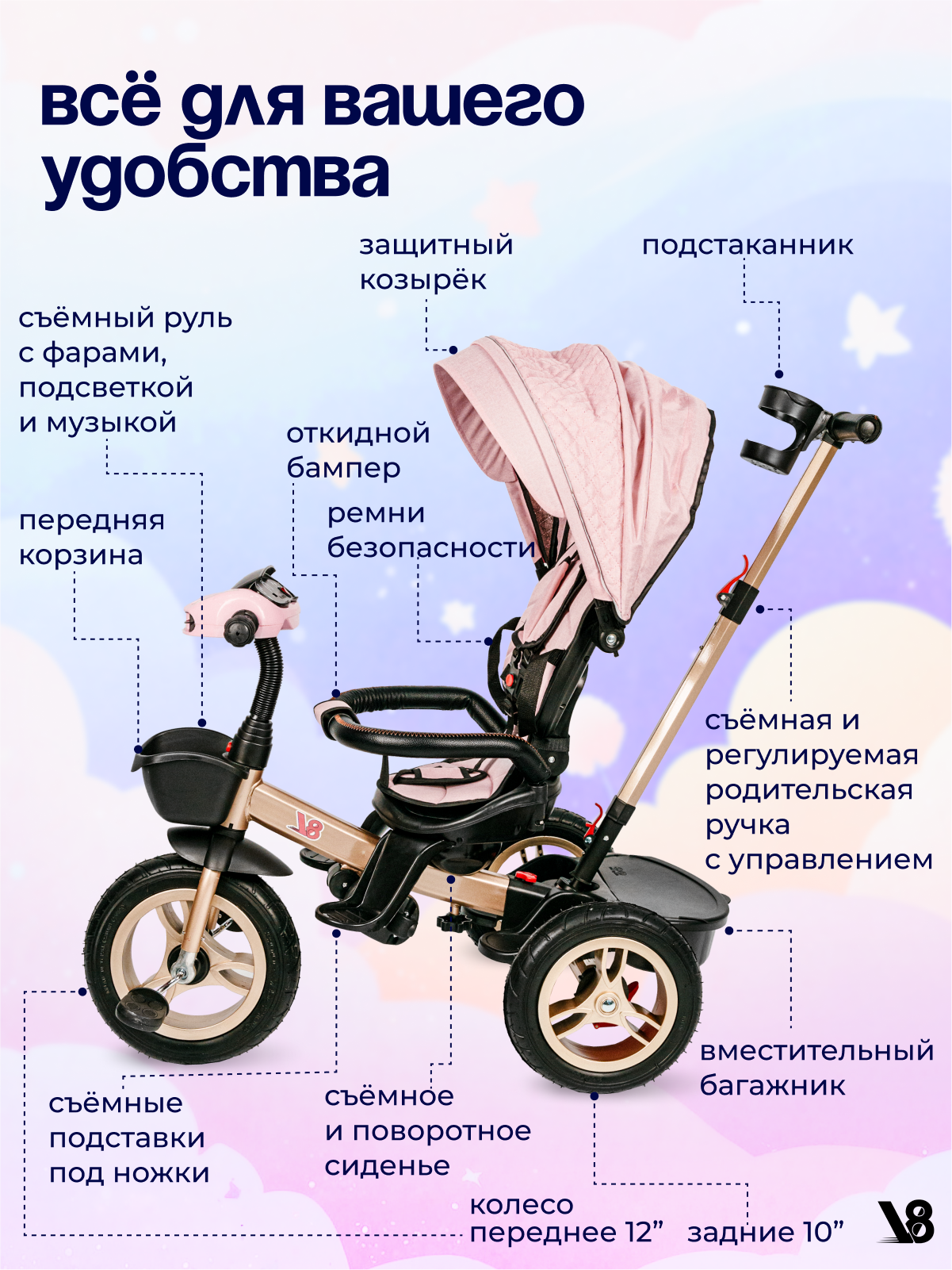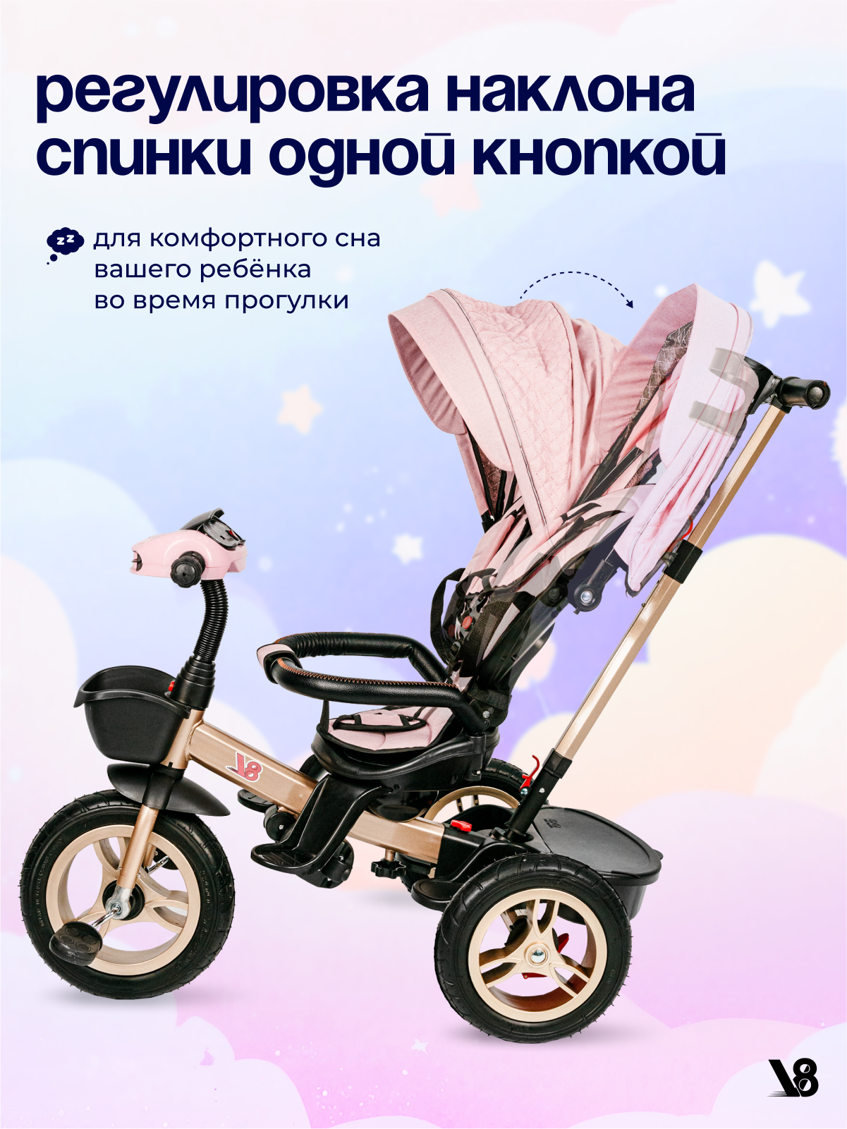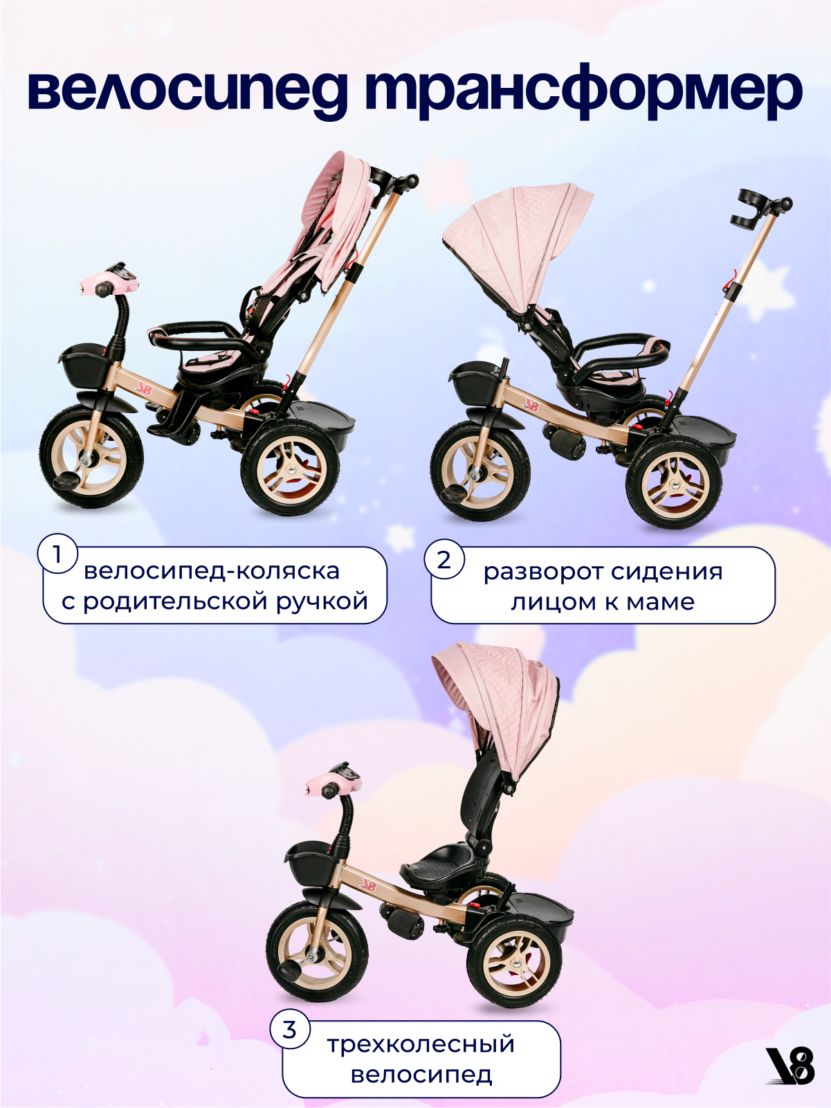 Велосипед трехколесный V8 V-TR311 розовый, золотой, для девочек от 6 месяцев до 7 лет на рост 80-110 см интересное: