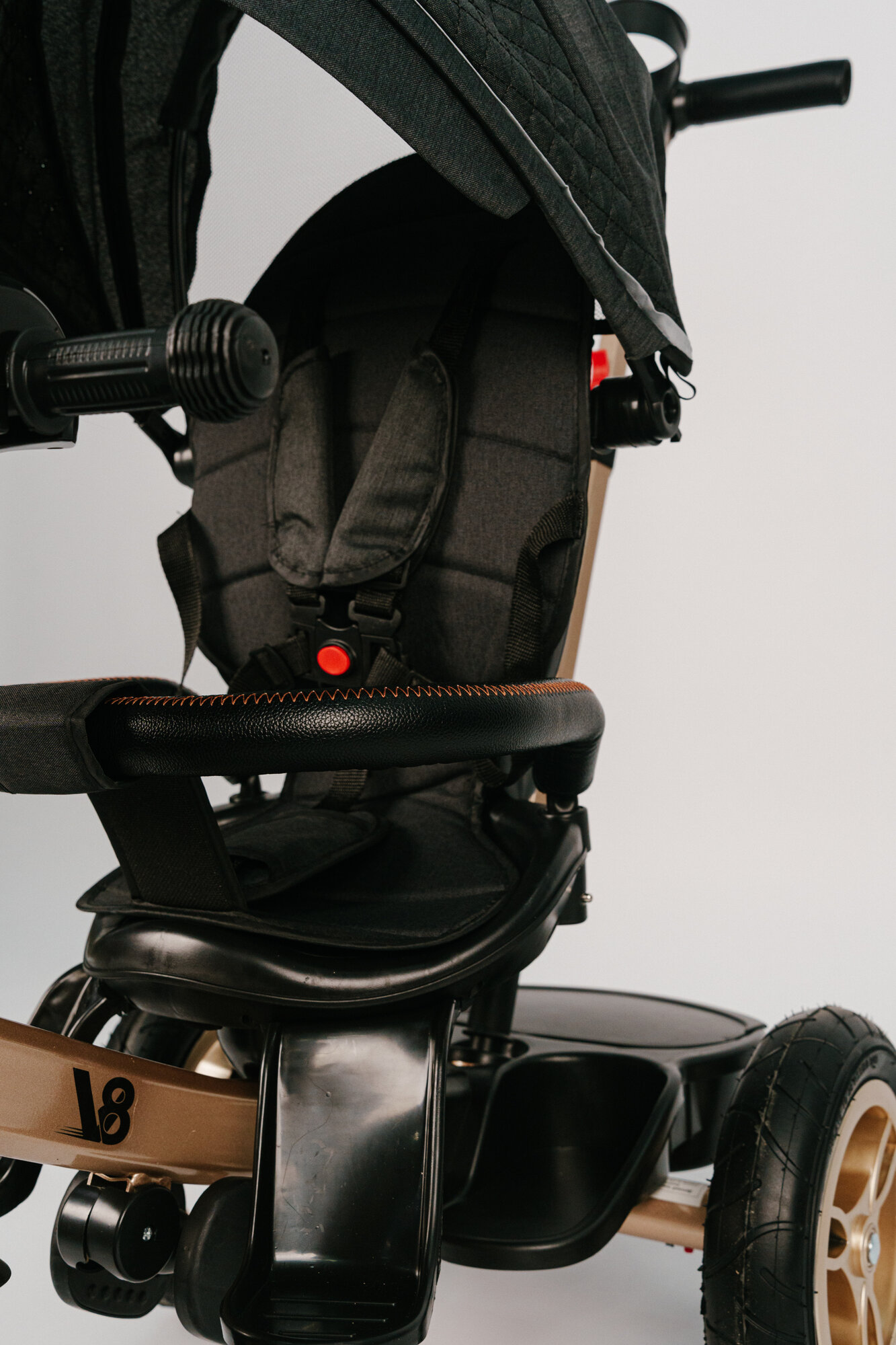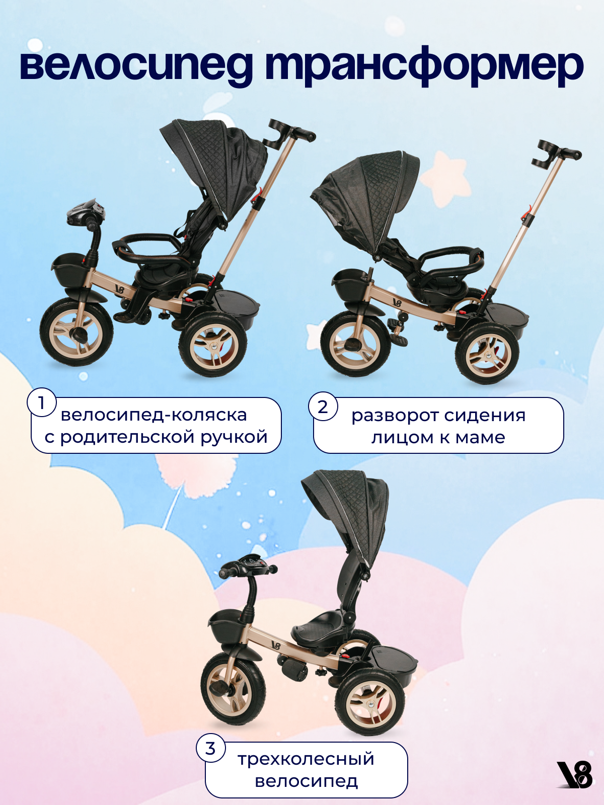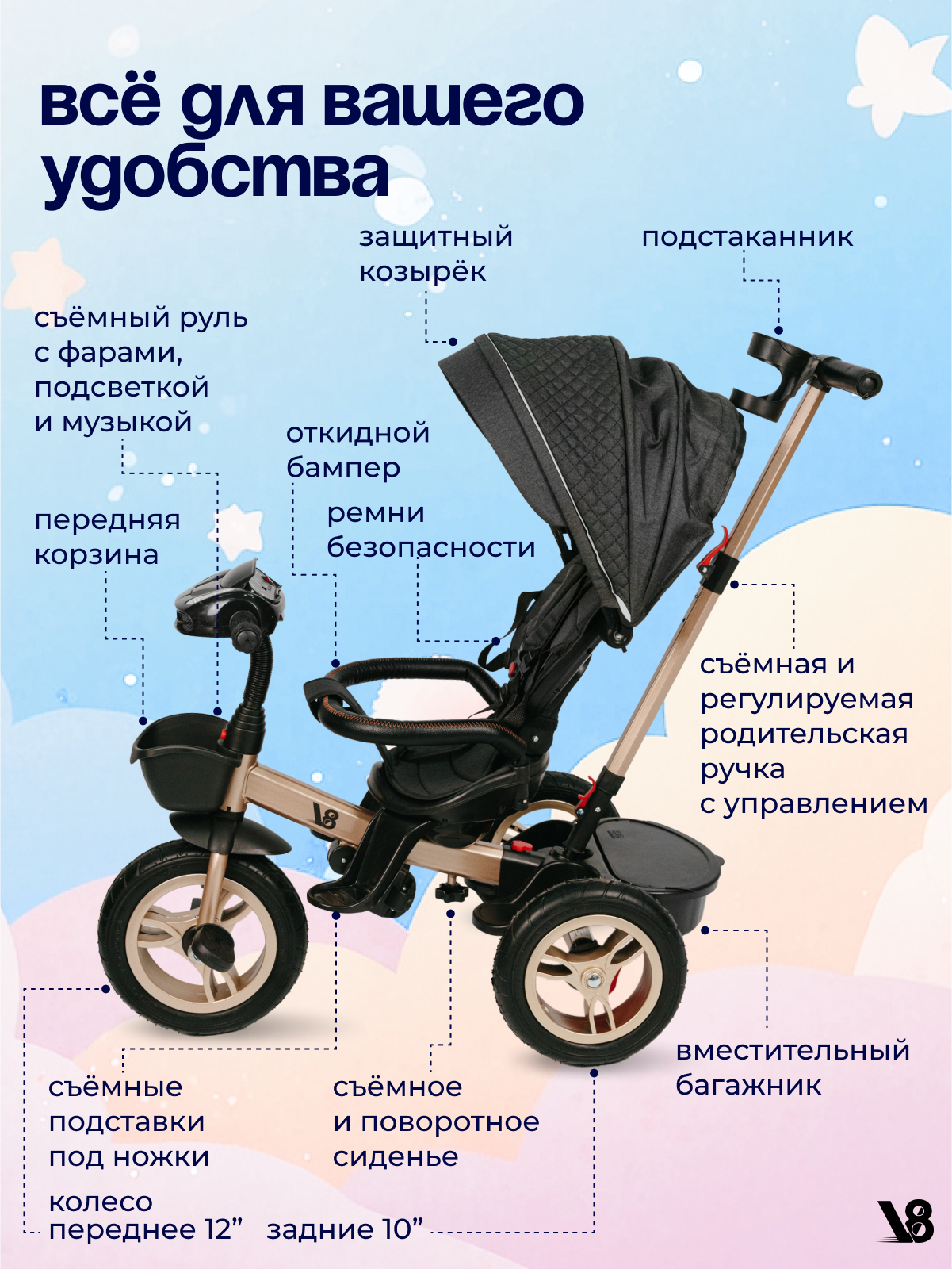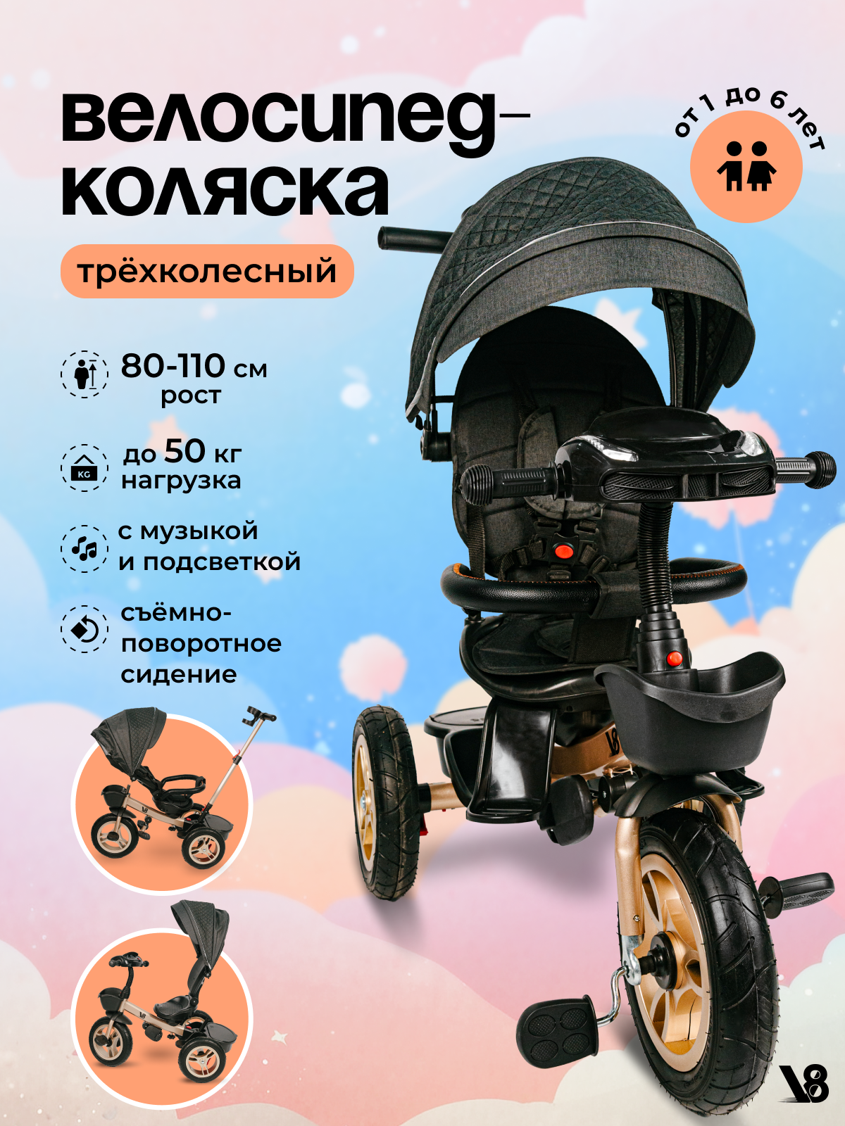 Велосипед трехколесный V8 V-TR310 черный, золотой, для мальчиков и девочек от 6 месяцев до 7 лет на рост 80-110 см интересное: