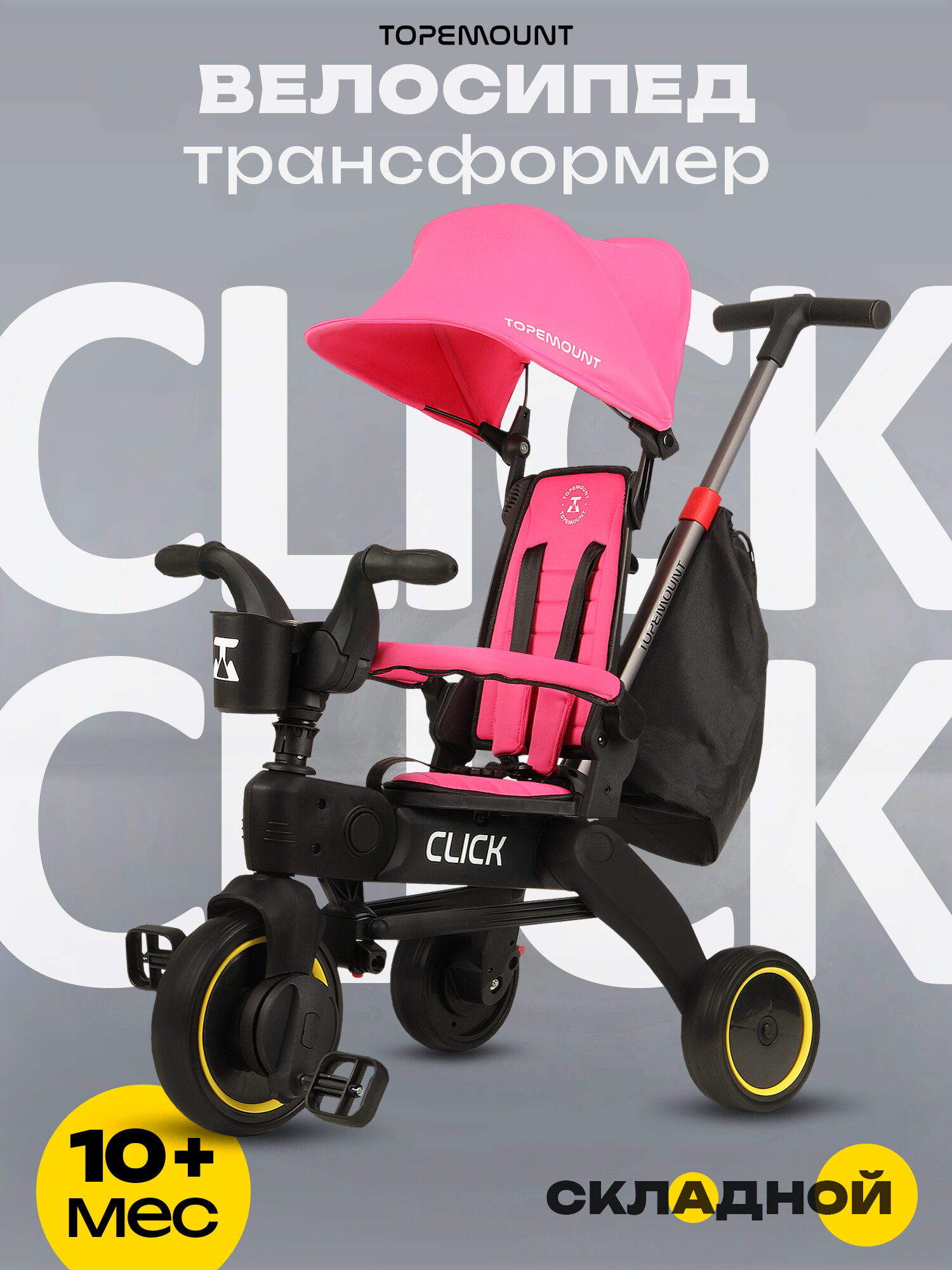 Велосипед трехколесный детский с ручкой складной "CLICK"; трансформер; розовый интересное: