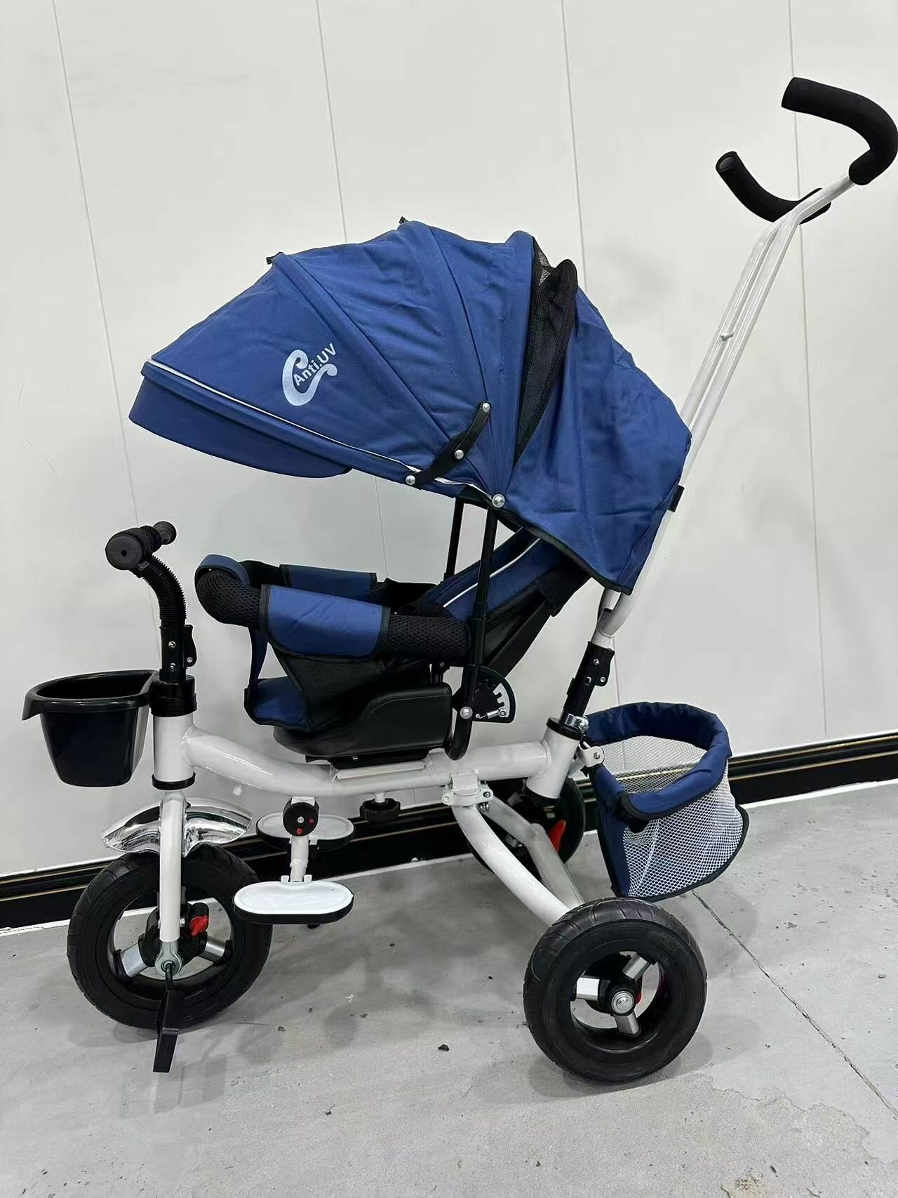Велосипед-коляска, с козырьком и ручкой, трехколесный, черно-синий
