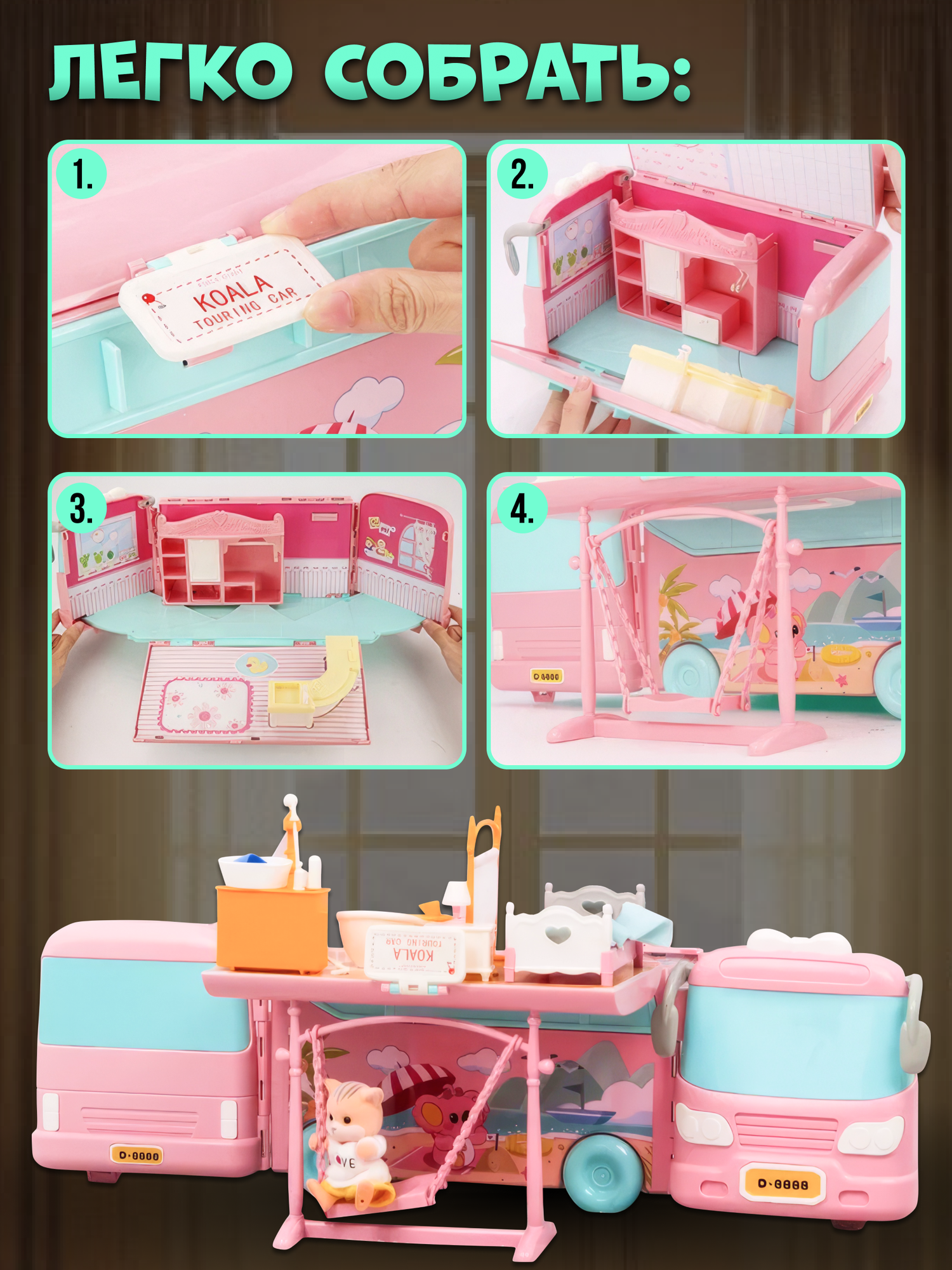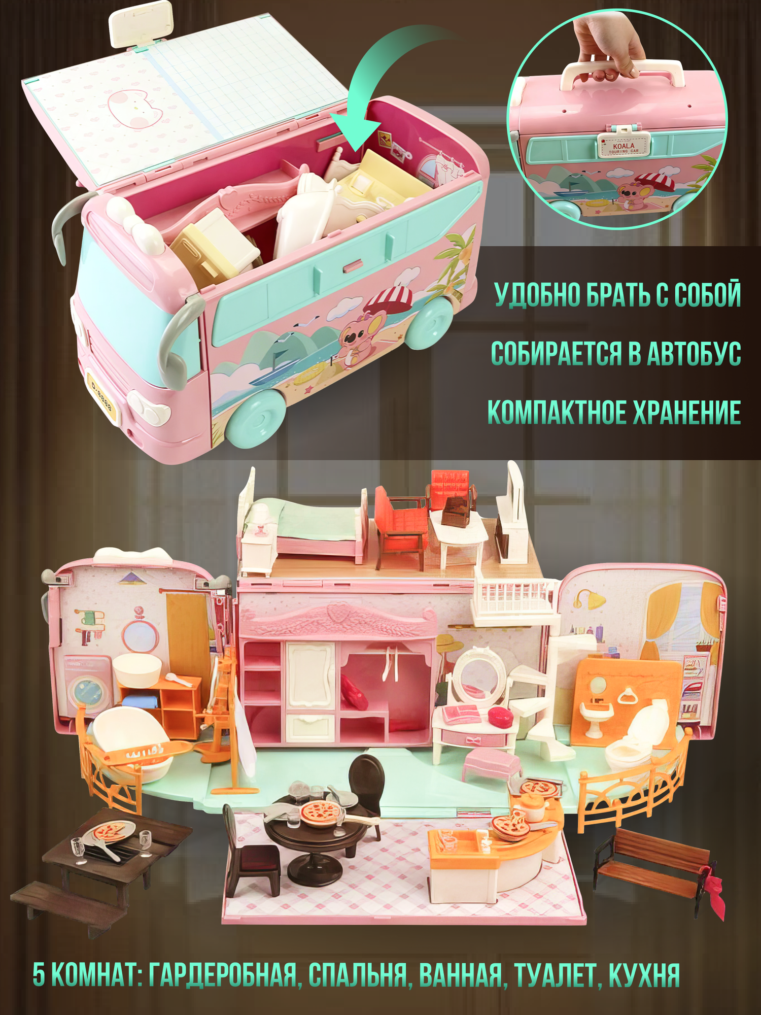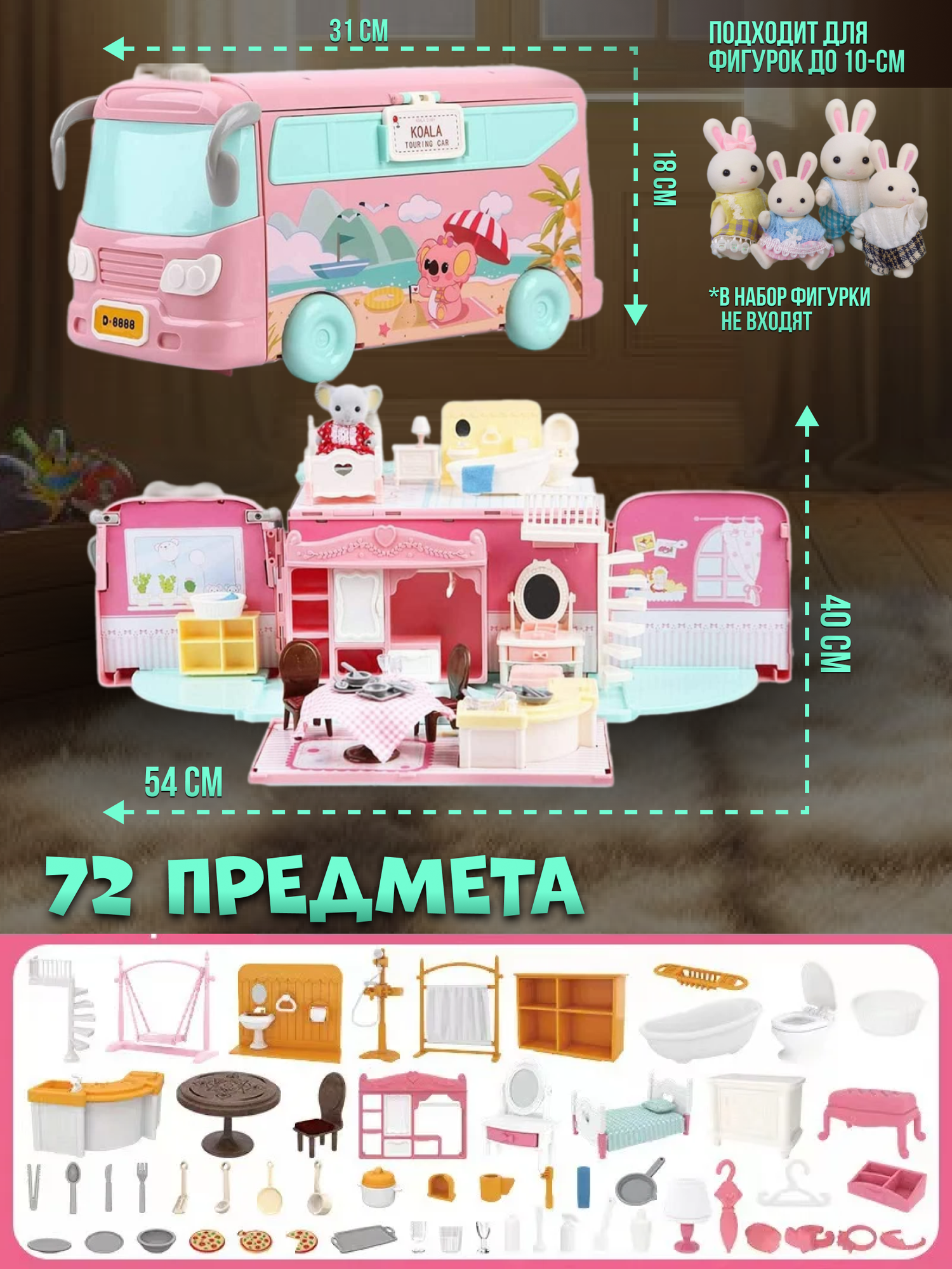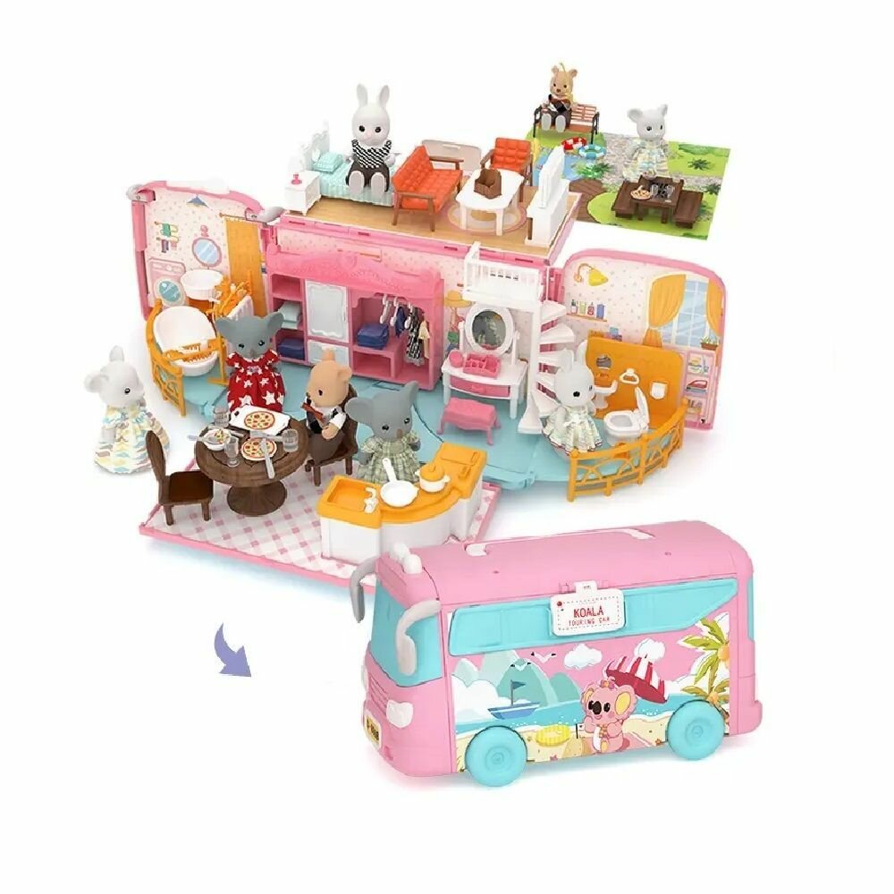 Кукольный домик Автобус с мебелью, 72 элемента, размер собранного домика 54 х 40 х 17 см, питомцы в комплект не входят интересное: