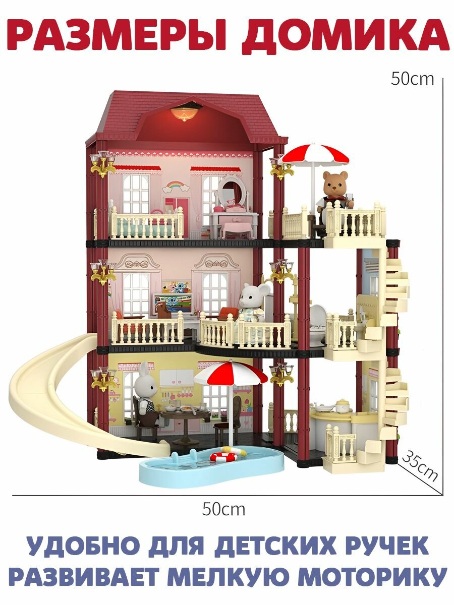 Купить Кукольный домик с мебелью и подсветкой, 3 этажа, 3 фигурки в комплекте. Высота 50 см