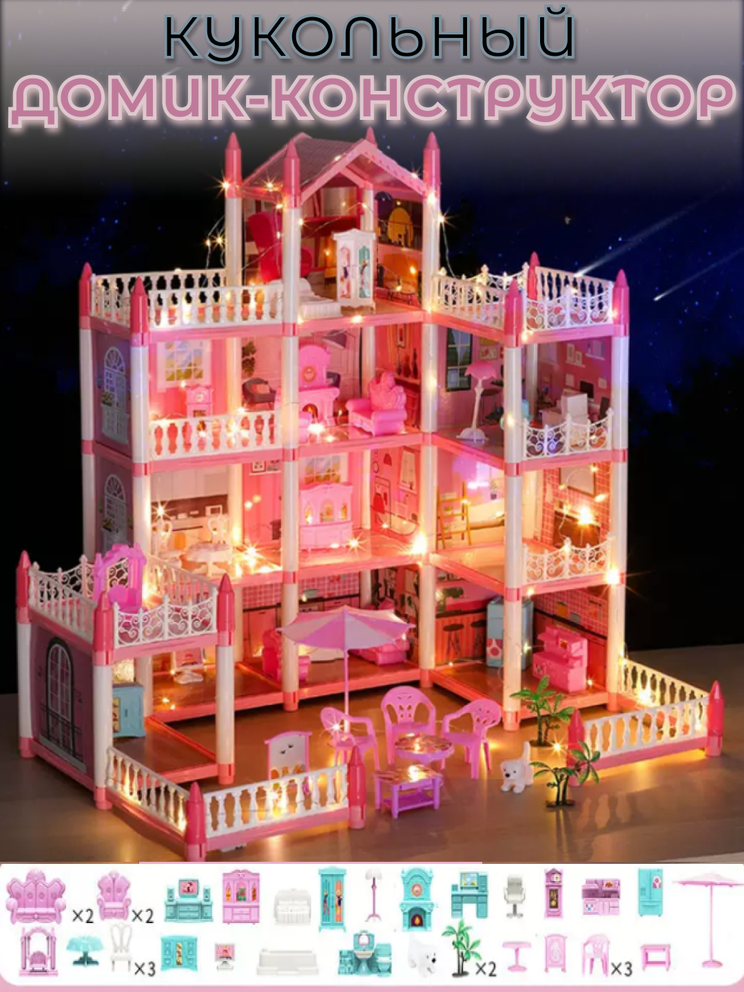 Кукольный домик - конструктор, домик для кукол 14 комнат, с подсветкой, розовый интересное: