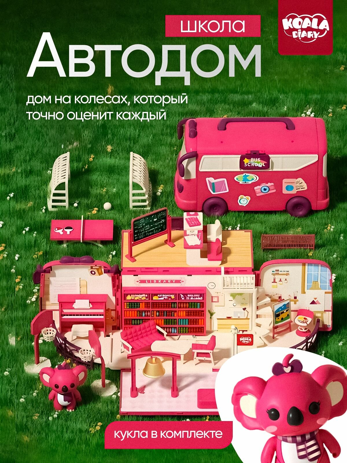 Купить Домик-трансформер на колесах розовый - Школьный автобус с мебелью и куклой Koala Diary FDE81120