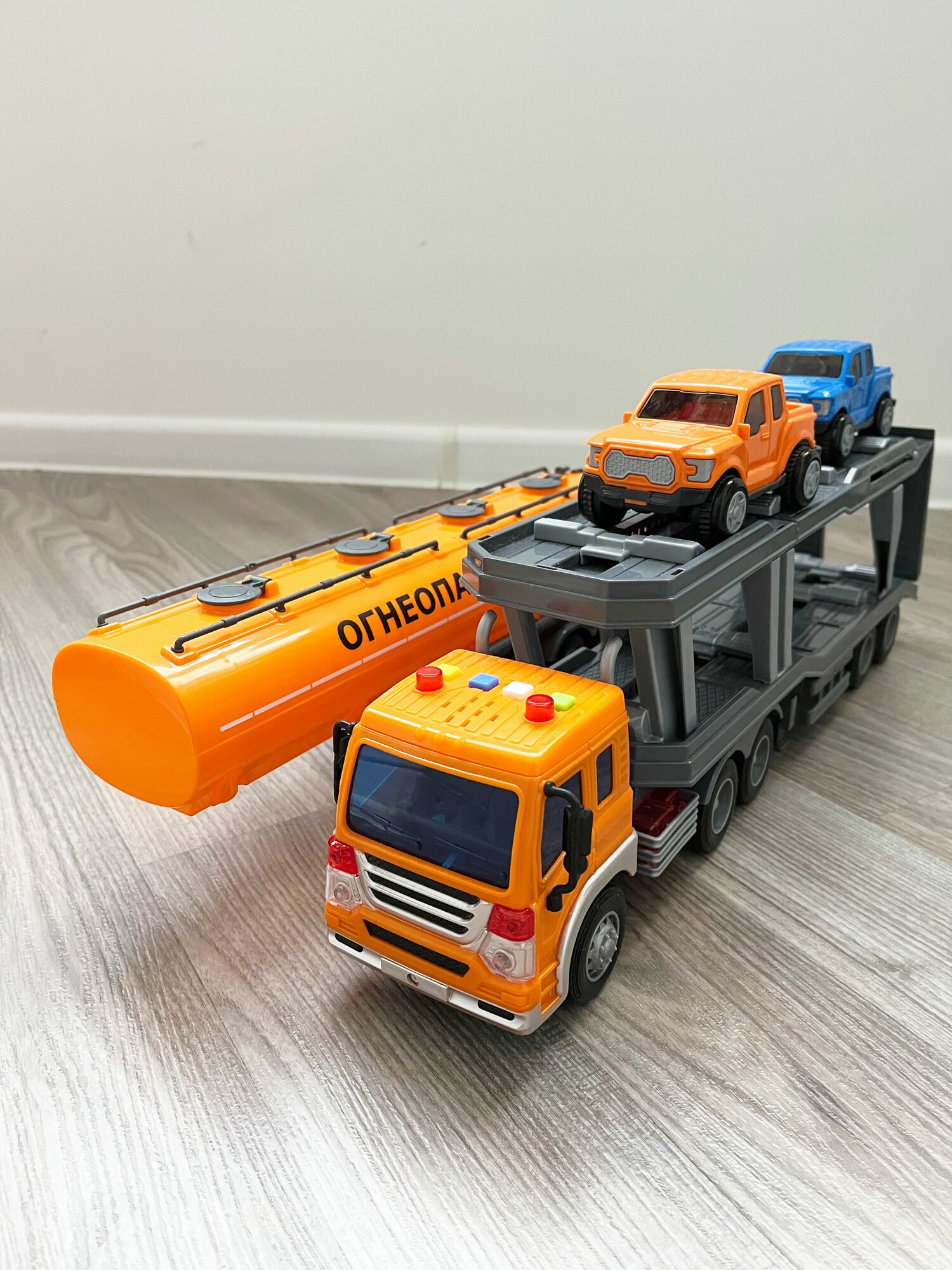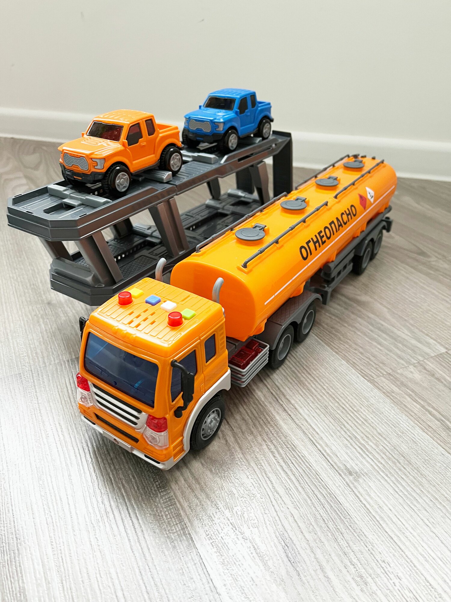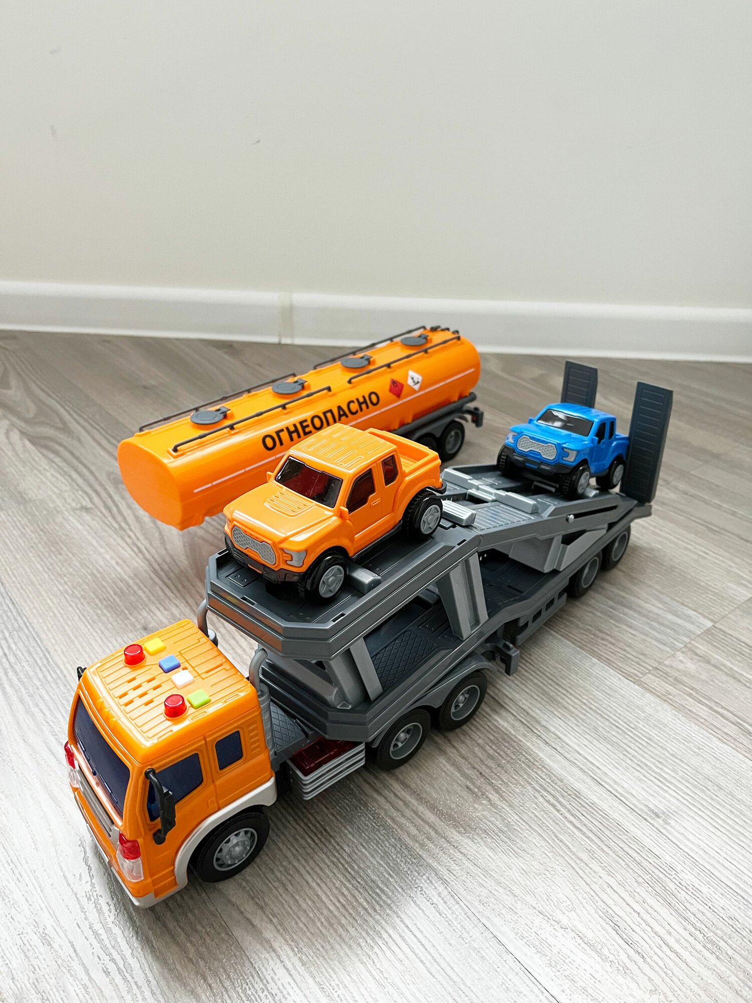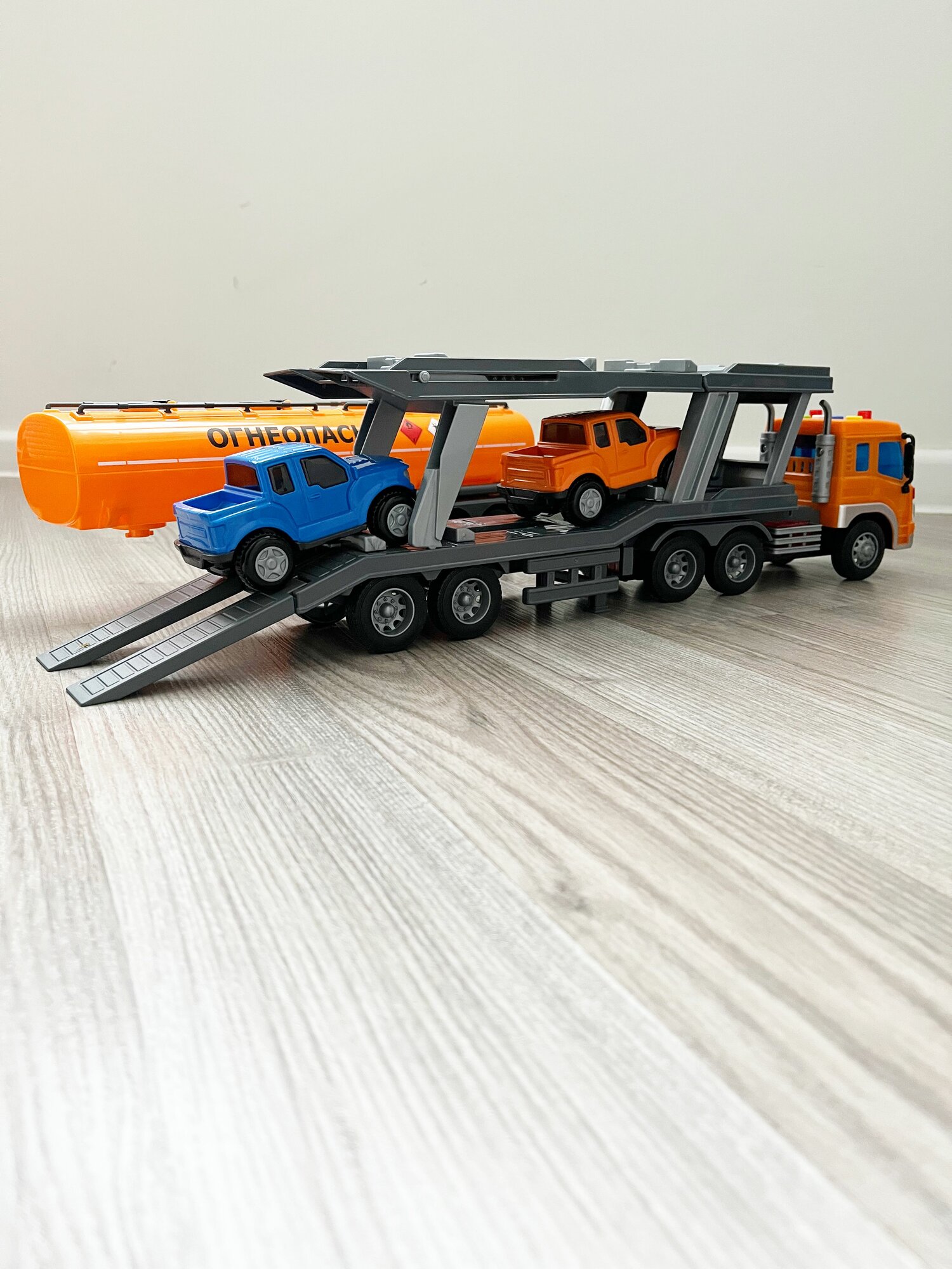 Набор 2 прицепа (цистерна + автовоз с 2-мя машинками) + тягач Сити (динамо-инерция, свет, 4 звука) / Полесье - оранжевый интересное: