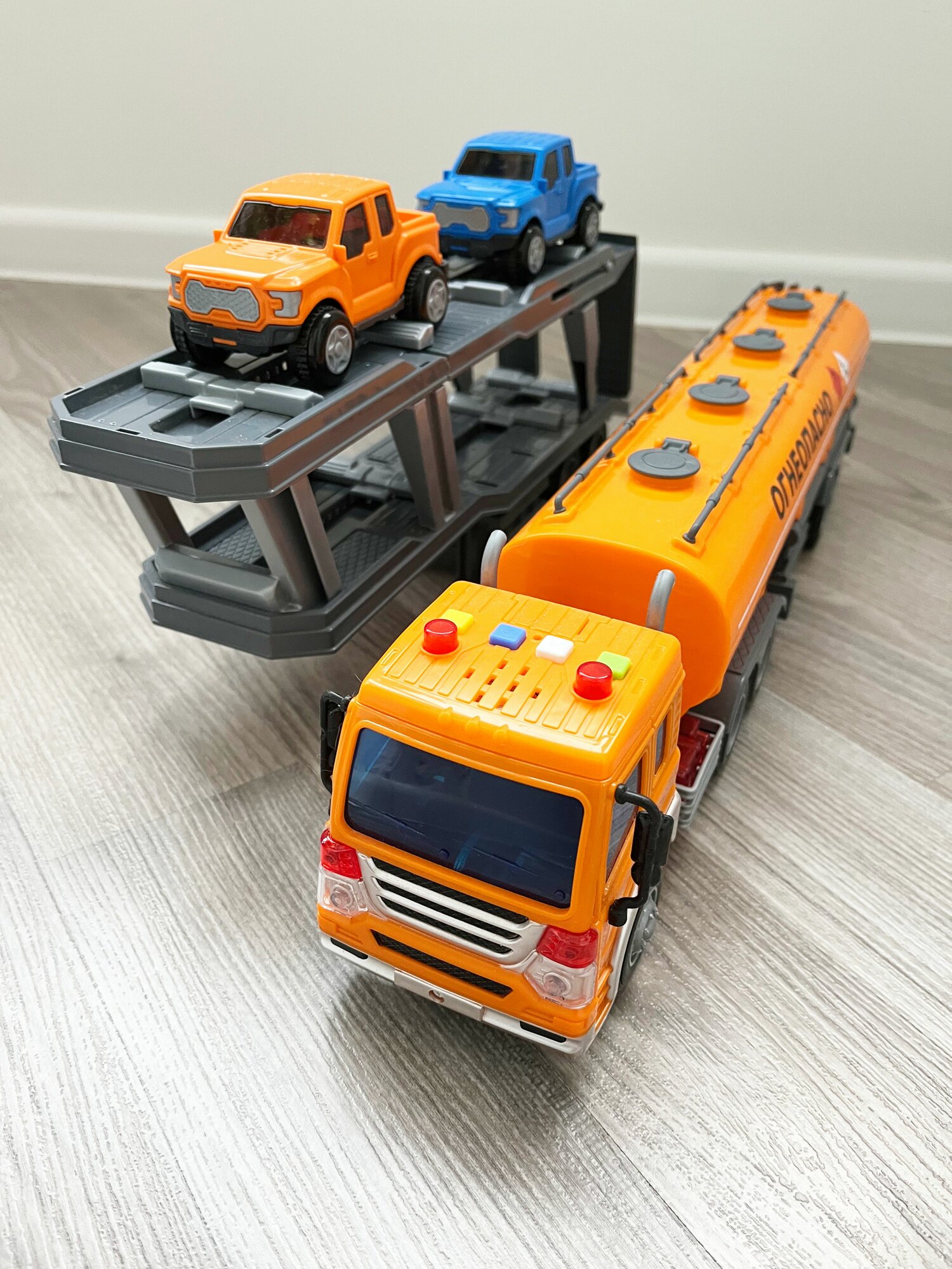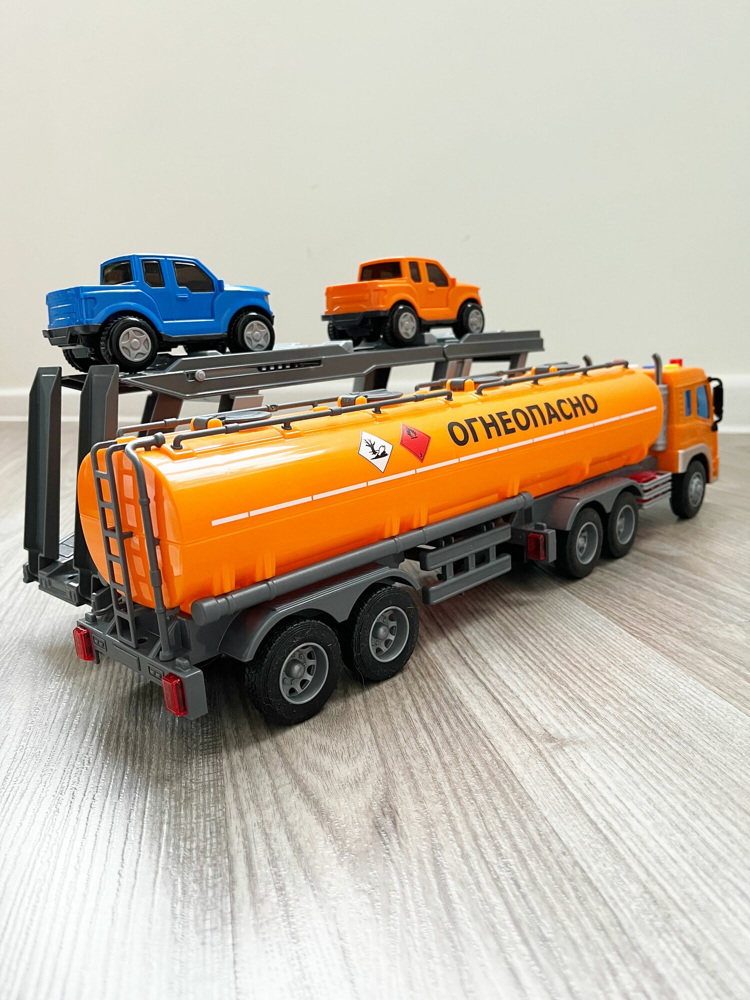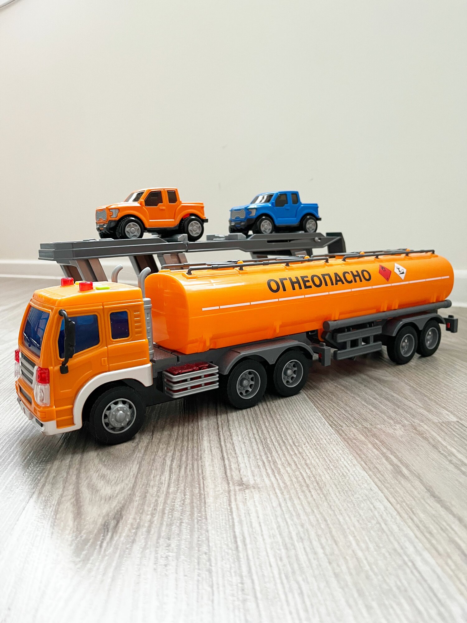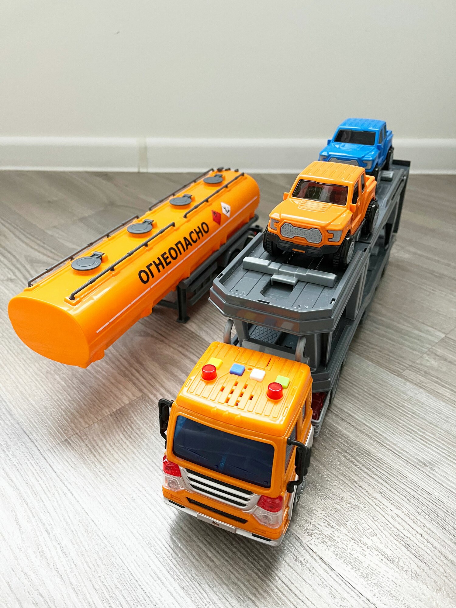 Набор 2 прицепа (цистерна + автовоз с 2-мя машинками) + тягач Сити (динамо-инерция, свет, 4 звука) / Полесье - оранжевый интересное: