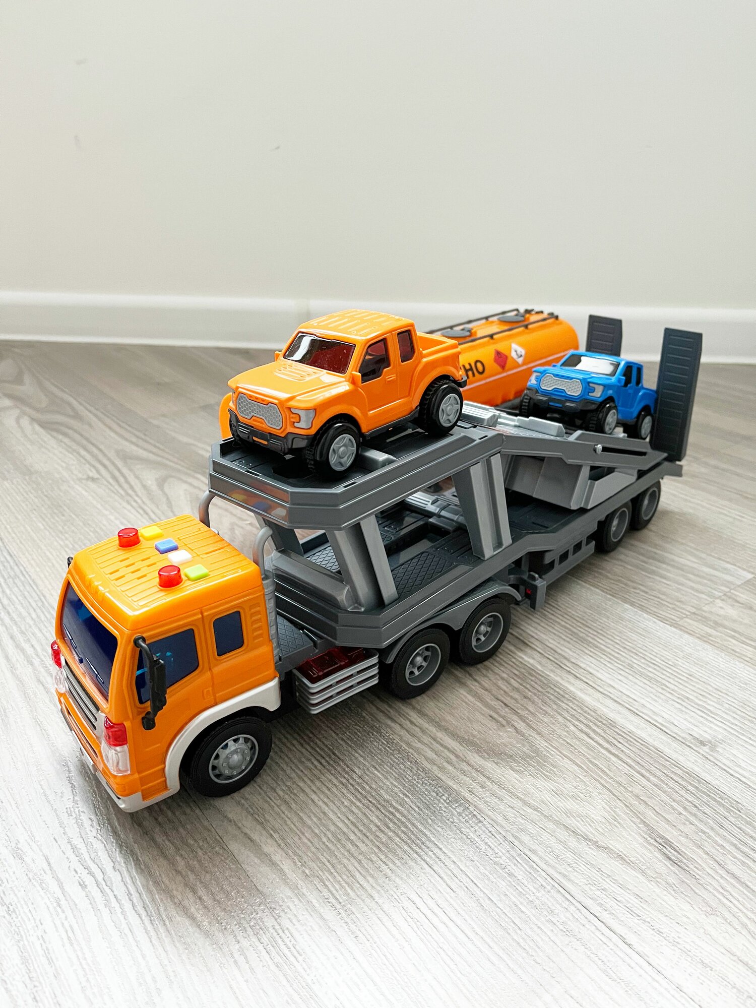 Купить Набор 2 прицепа (цистерна + автовоз с 2-мя машинками) + тягач Сити (динамо-инерция, свет, 4 звука) / Полесье - оранжевый