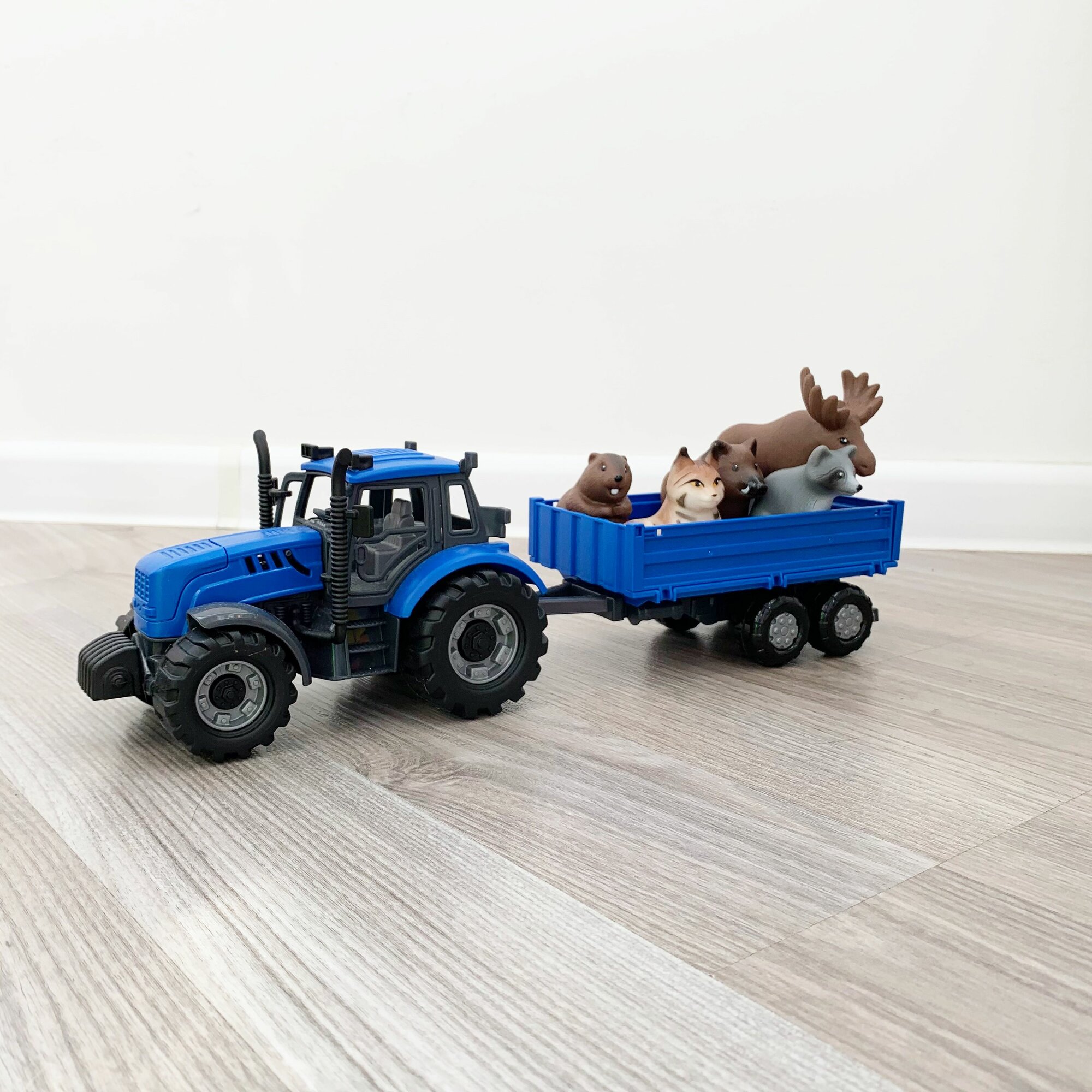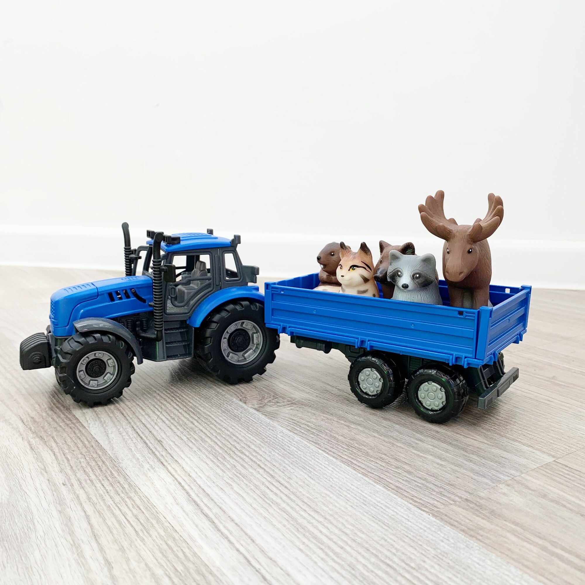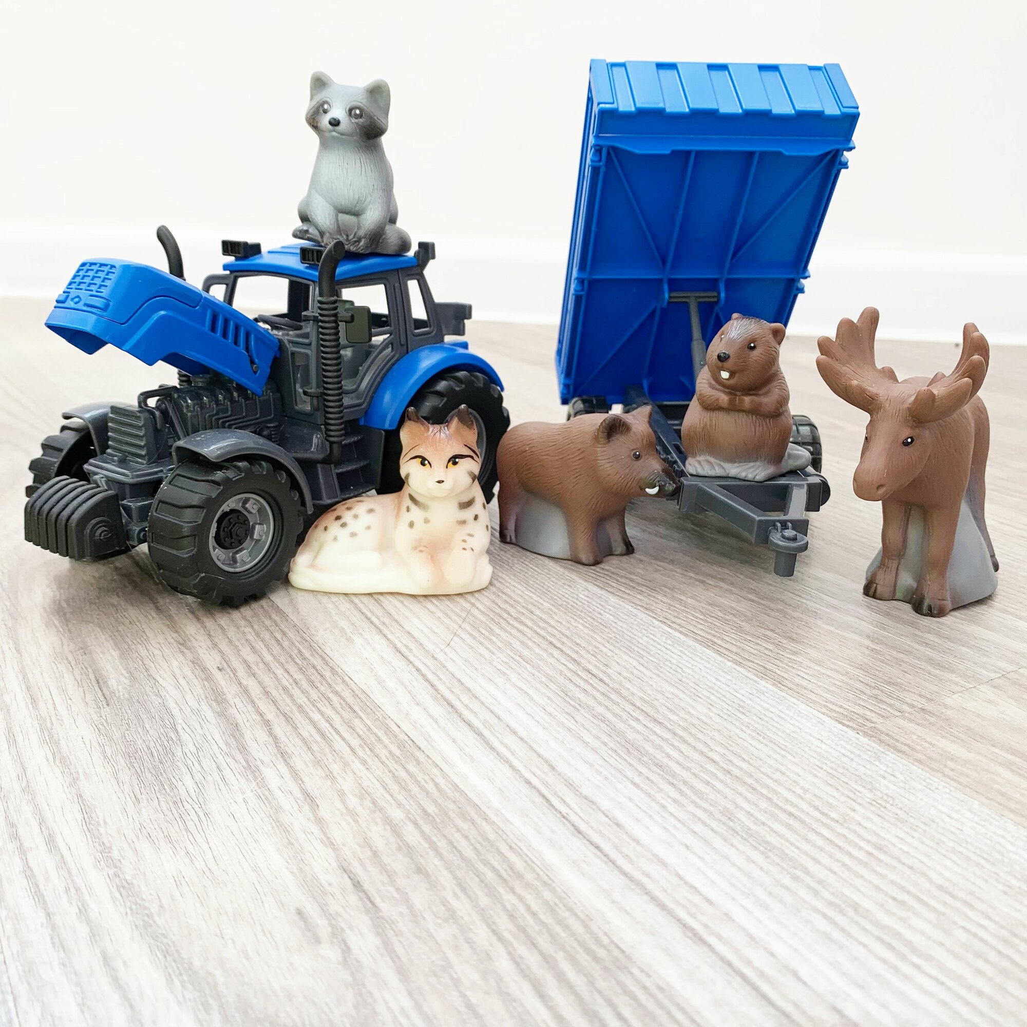 Набор инерционный трактор с прицепом и 5 фигурок животных леса и тайги / Полесье (синий) интересное: