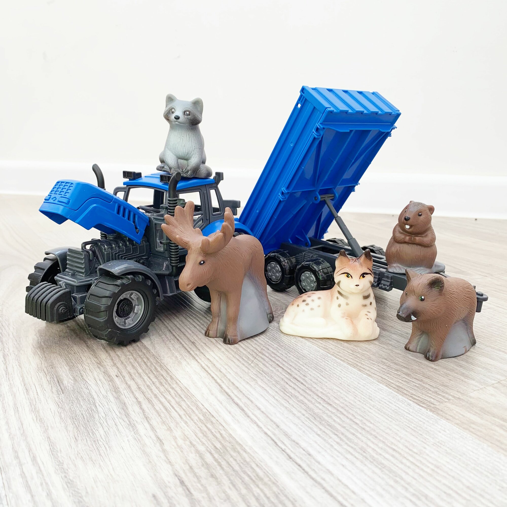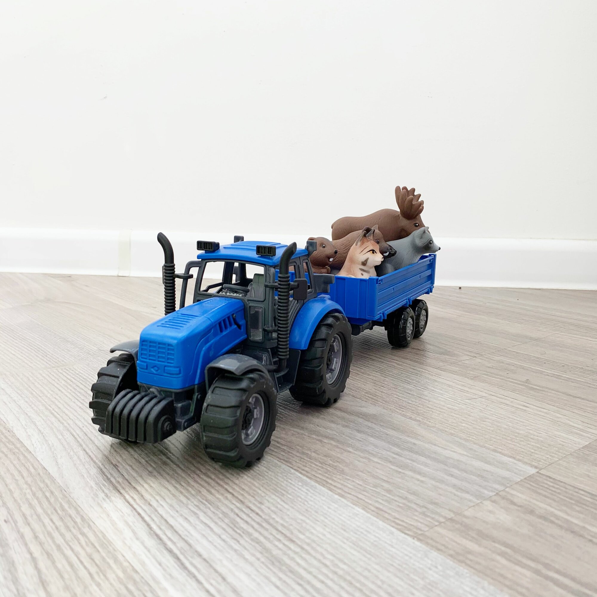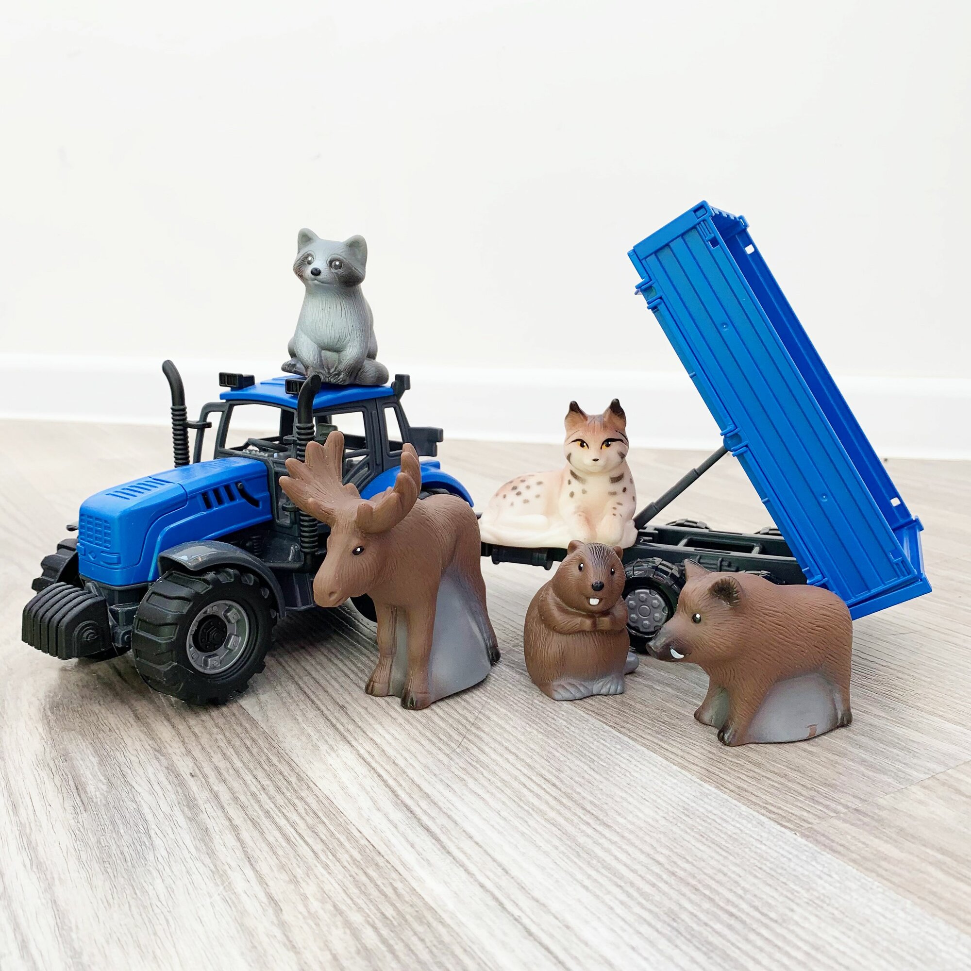 Набор инерционный трактор с прицепом и 5 фигурок животных леса и тайги / Полесье (синий) интересное: