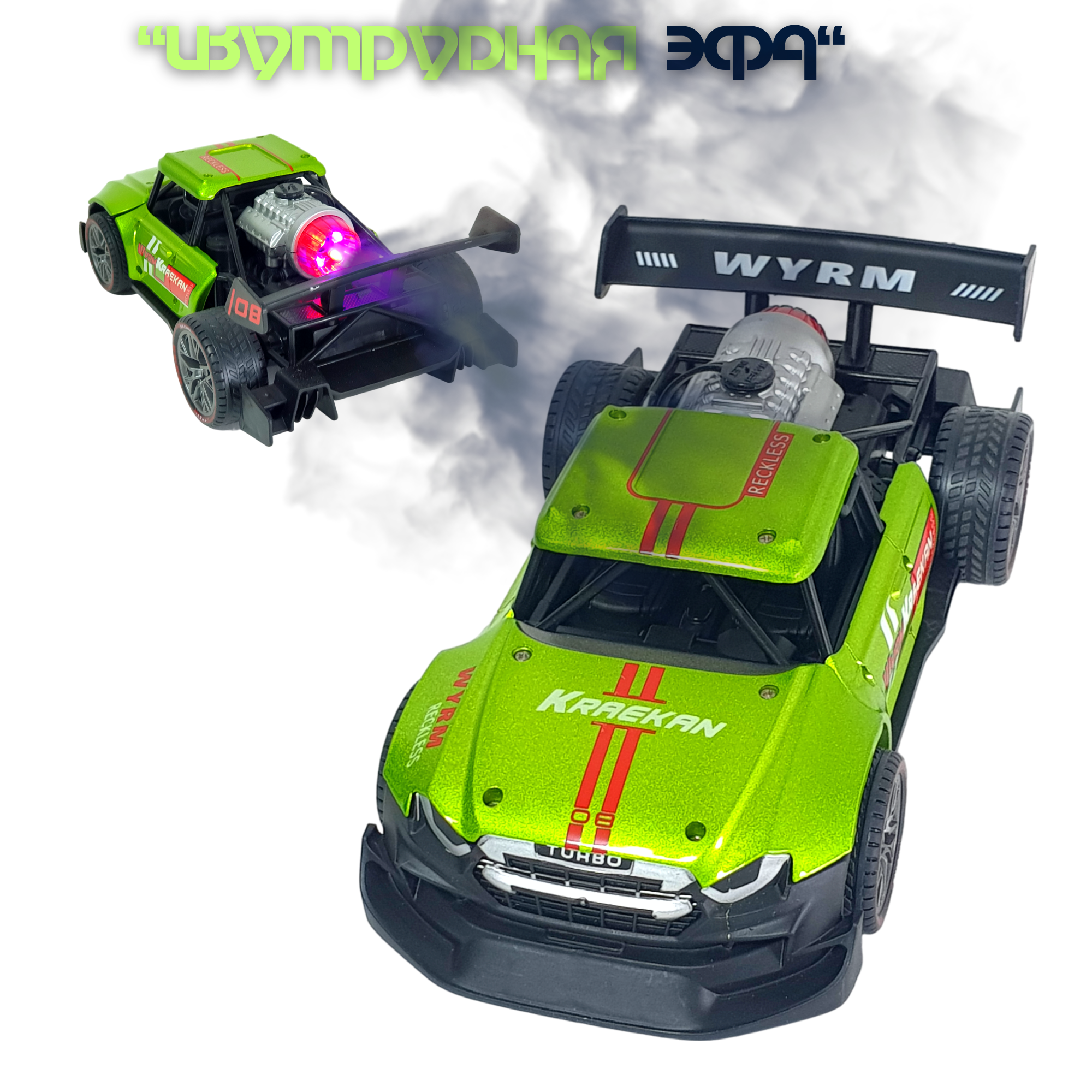 Машинка на радиоуправлении c металлическим каркасом и эффектом дыма серебристо-зеленая