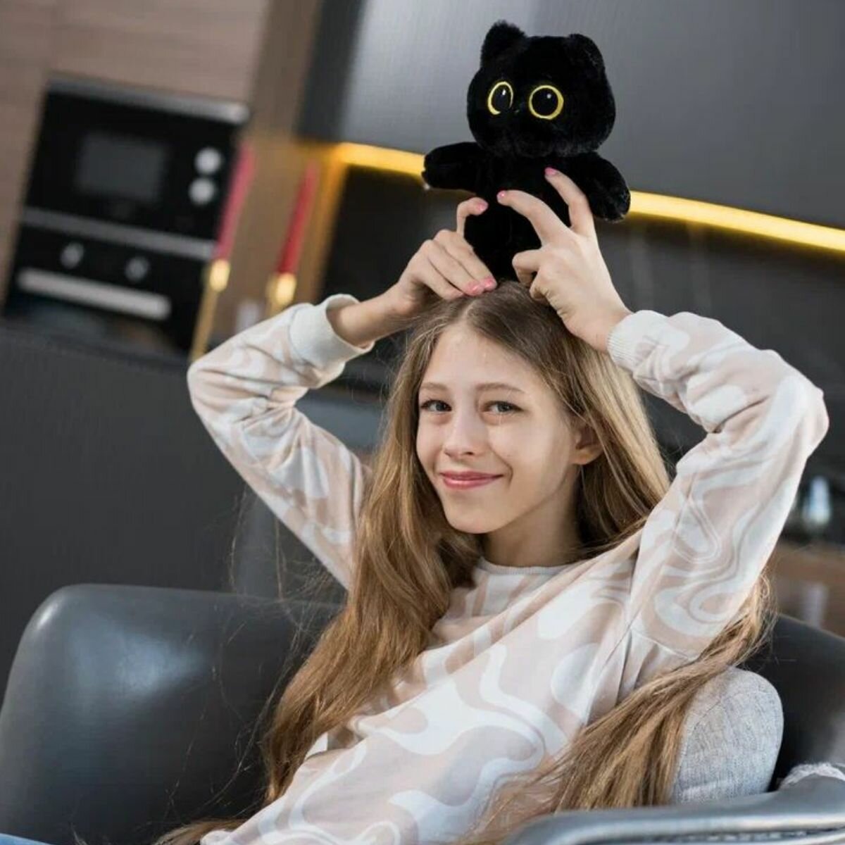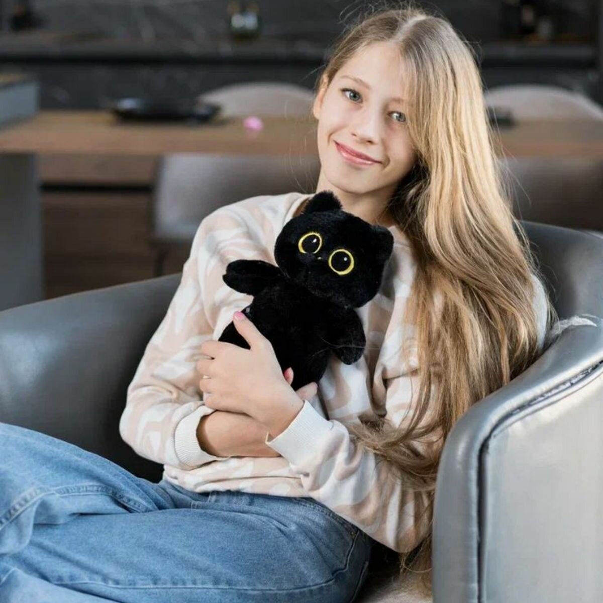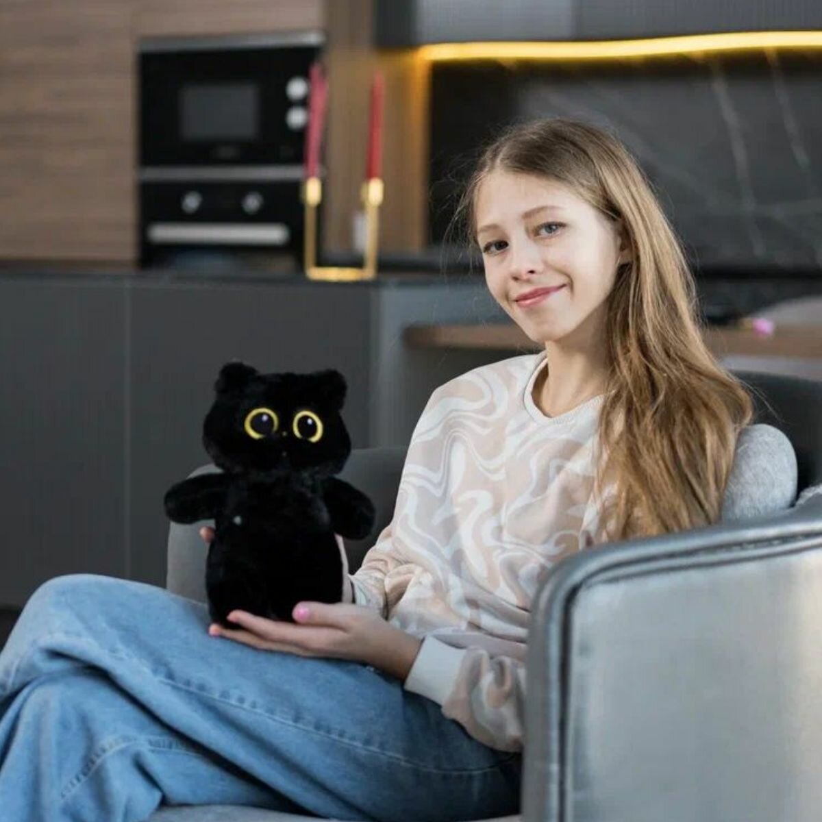 Мягкая игрушка котенок Лупоглазик, котик с круглыми глазами, КупиКота, 30 см, черный