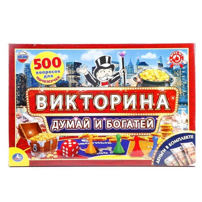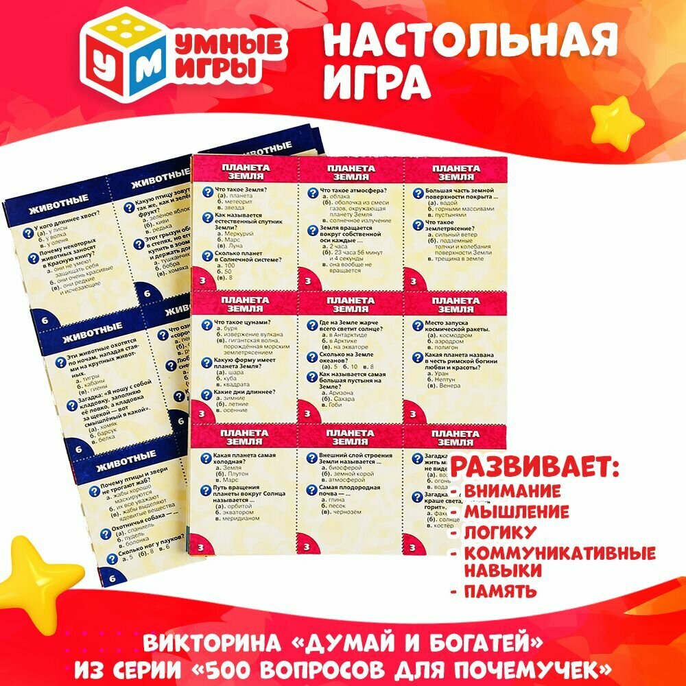 Купить Настольная игра Викторина Думай и богатей, Умные игры, 500 вопросов, 2-4 игрока, для детей старше 3-х лет