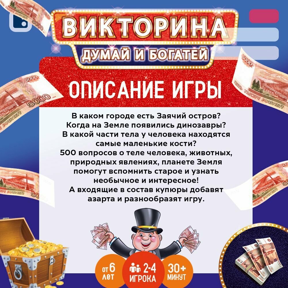 Настольная игра Викторина Думай и богатей, Умные игры, 500 вопросов, 2-4 игрока, для детей старше 3-х лет интересное: