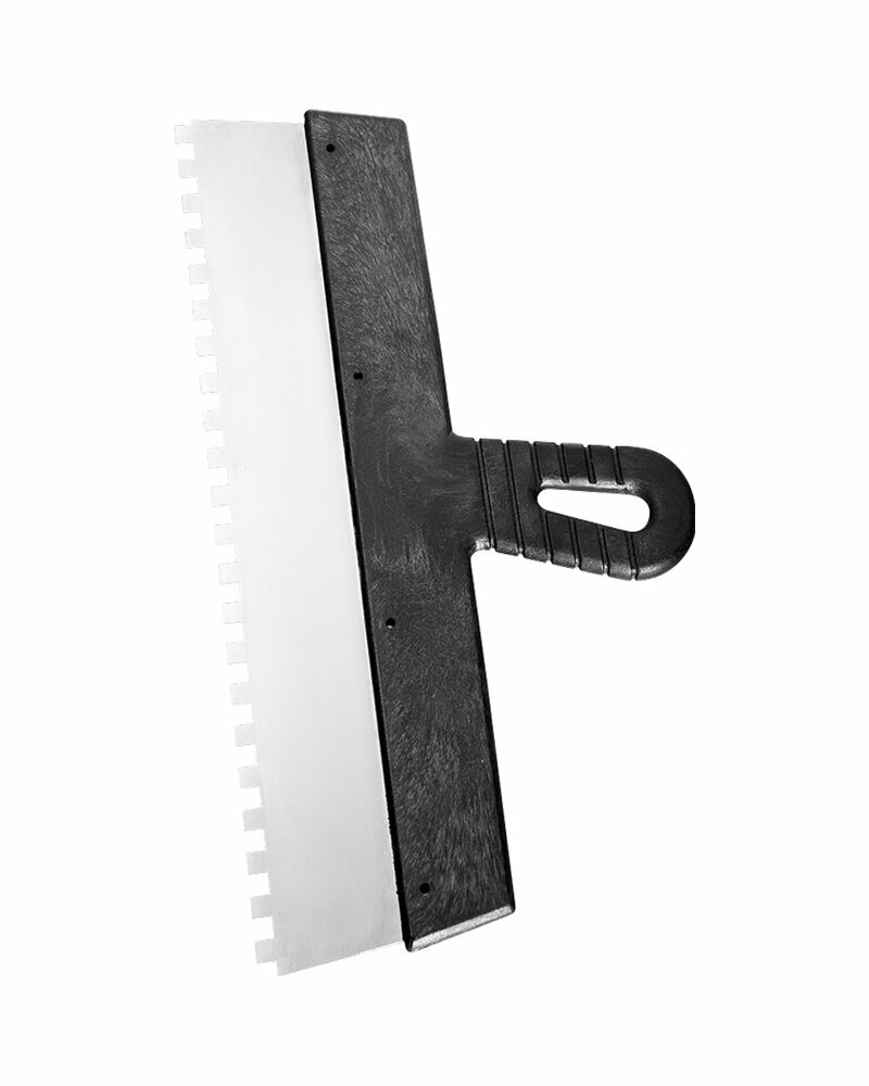 Шпатель из стали, 200 мм, зуб 4 х 4 мм, пластмассовая ручка.