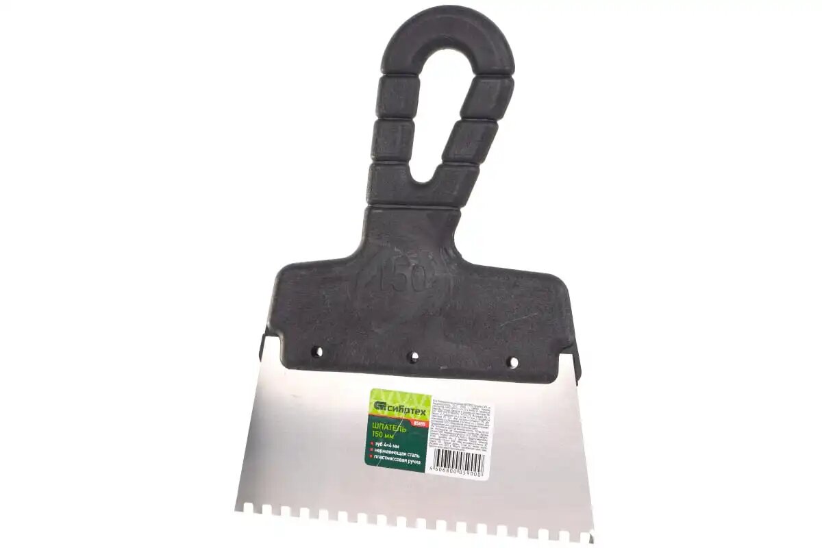 Шпатель из нержавеющей стали, 150 мм, зуб 4 х 4 мм, пластмассовая ручка 8545511 СИБРТЕХ 4606800059000