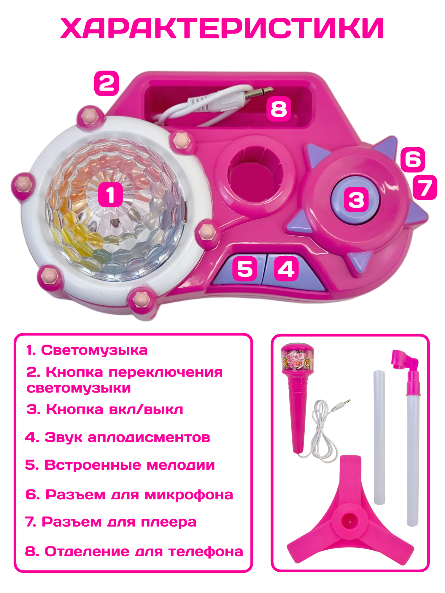 Набор Караоке стойка с микрофоном Super Star, музыка, звук, свет, подключение к телефону, диско-шар, высота 70-95 см интересное: